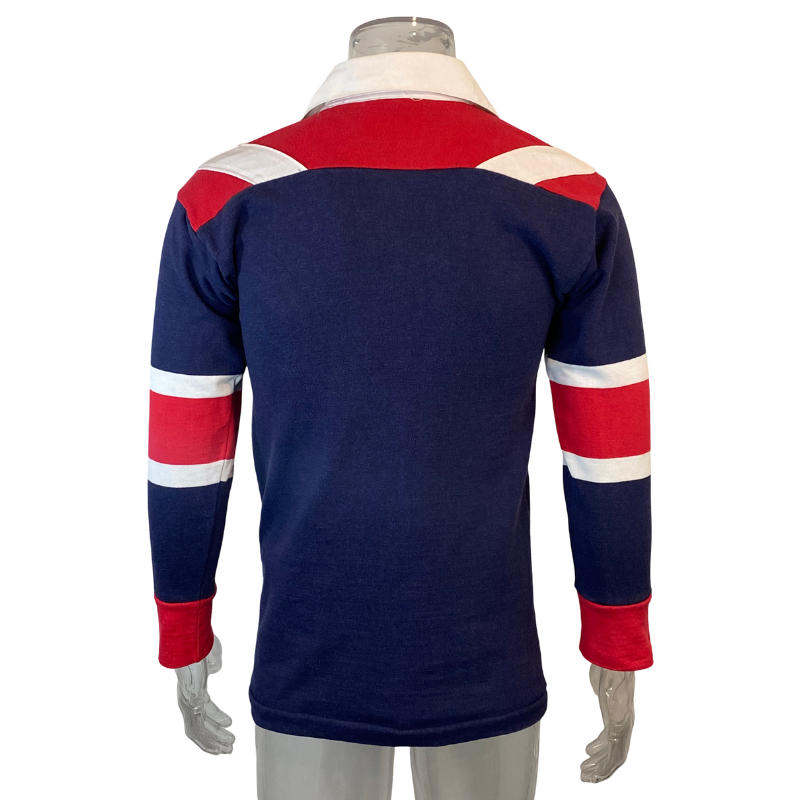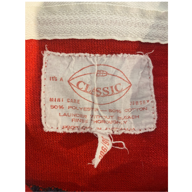 This Roosters jersey goes back to a time before front sponsor logos, yet it retains the classic Easts tri-colors. The jersey is in excellent condition, which is remarkable given its age, although it is a small size. It fits an adult in length, but is more suited to an extra small or youth in width – be sure to check the measurements if purchasing it to wear.
