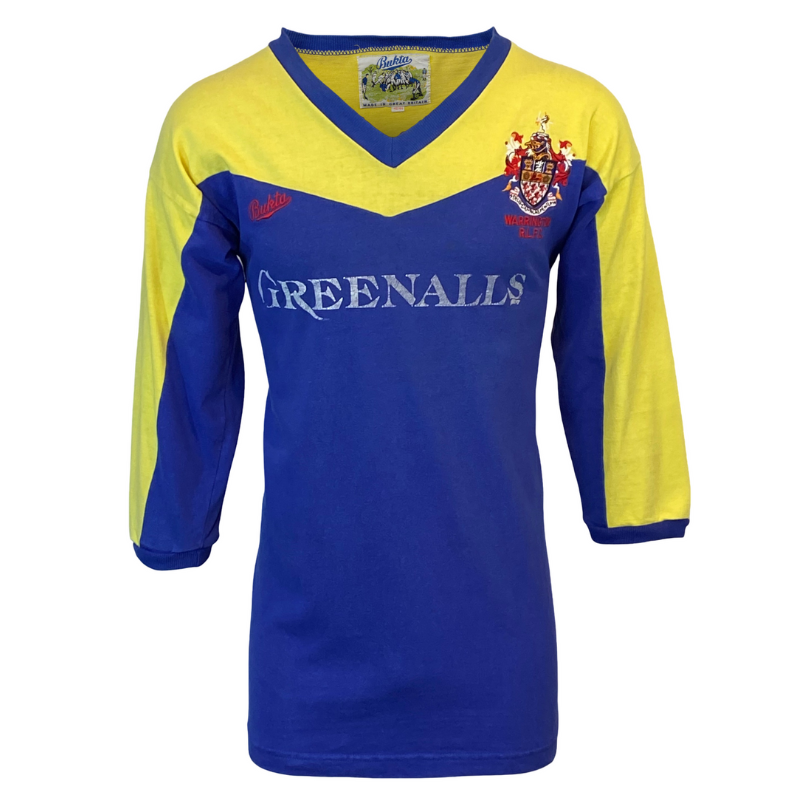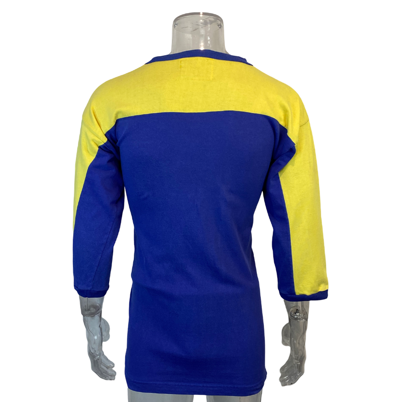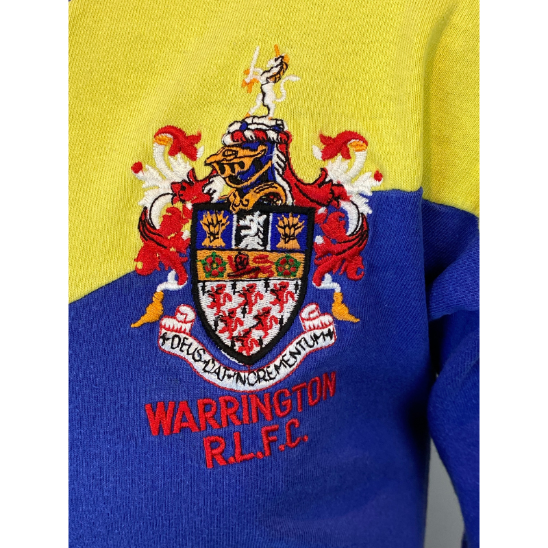 This very rare Warrington Wolves jersey hails from 1990, showcasing the club’s signature blue and yellow colors. Its classic V-neck design contributes to a vintage old-school look. The jersey remains in excellent condition, bearing only a few minor marks. Manufactured by Bukta.