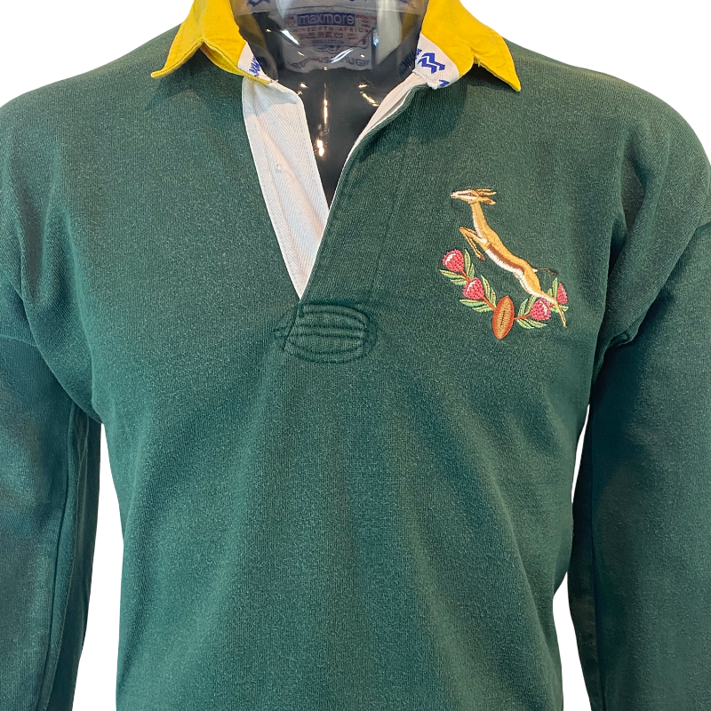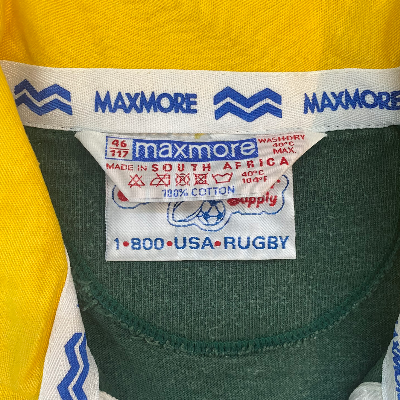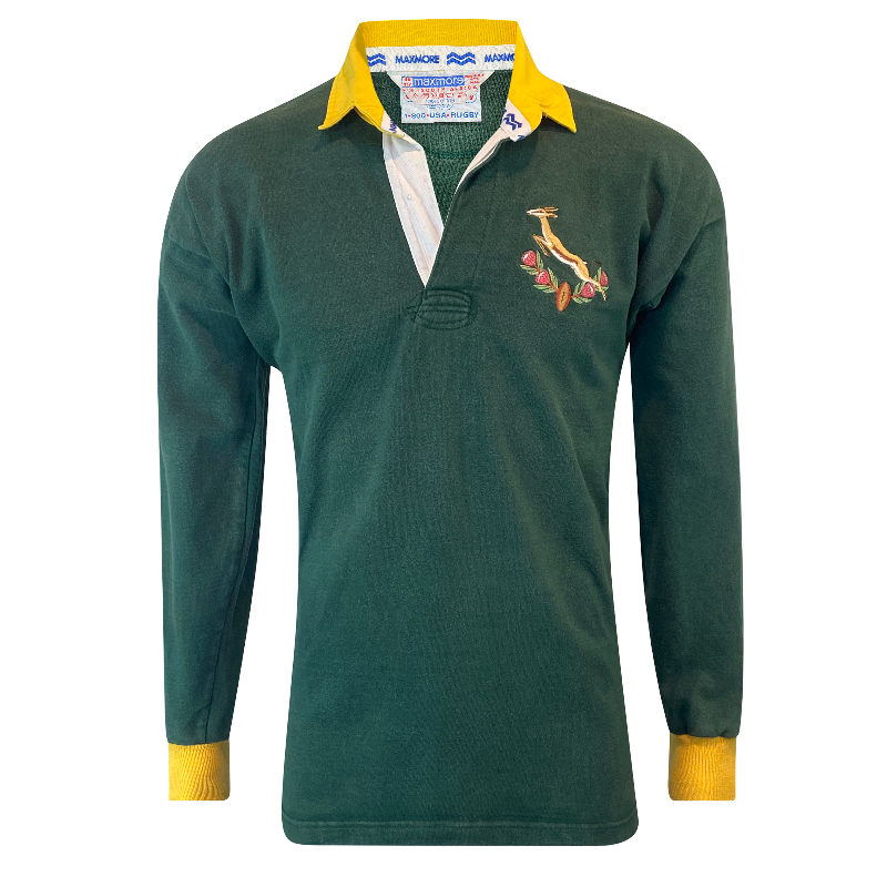 The 1992 Springboks jersey marks South Africa’s return to the international rugby stage after years of isolation, making it one of the most historically significant pieces in modern rugby history. This design features the updated national emblem introduced when South Africa was officially welcomed back into test arena — a powerful symbol of a new era for the Springboks. Manufactured by the ever-popular South African brand Maxmore, it is crafted from traditional heavyweight 100% cotton and built with the durability expected of early-90s rugby jerseys.