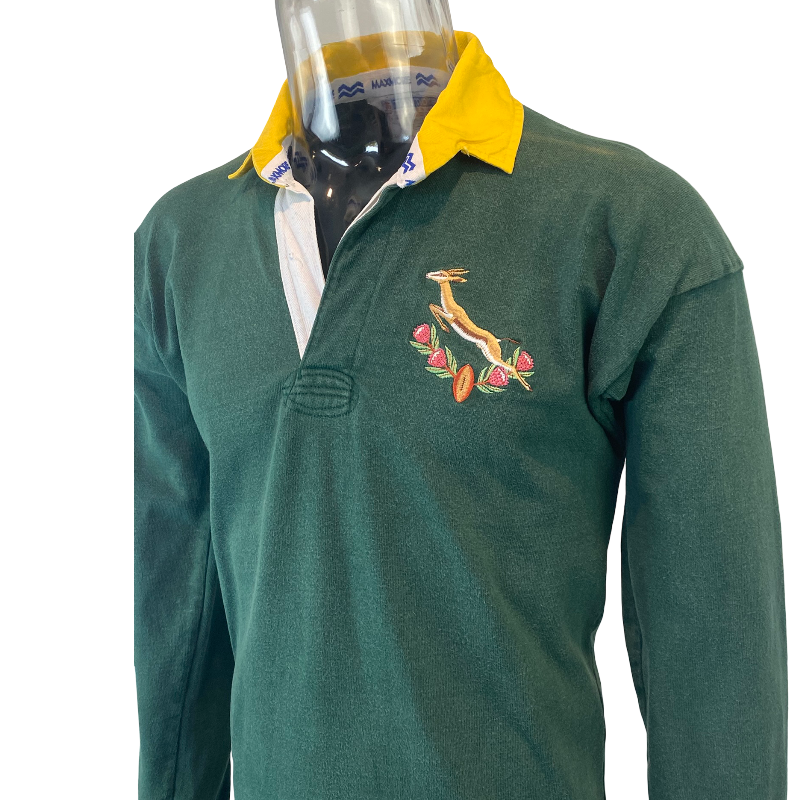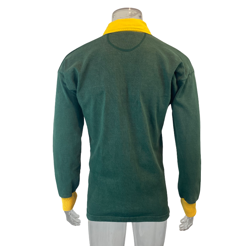 The deep green body is sharply contrasted by the bold yellow collar and cuffs, creating one of the cleanest and most recognisable Springbok designs of the period. The embroidered crest sits proudly on the chest, and the overall presentation remains excellent. Condition is excellent overall, with strong colour retention and fabric quality, with one small mark on the top of the left shoulder being the only noted flaw.