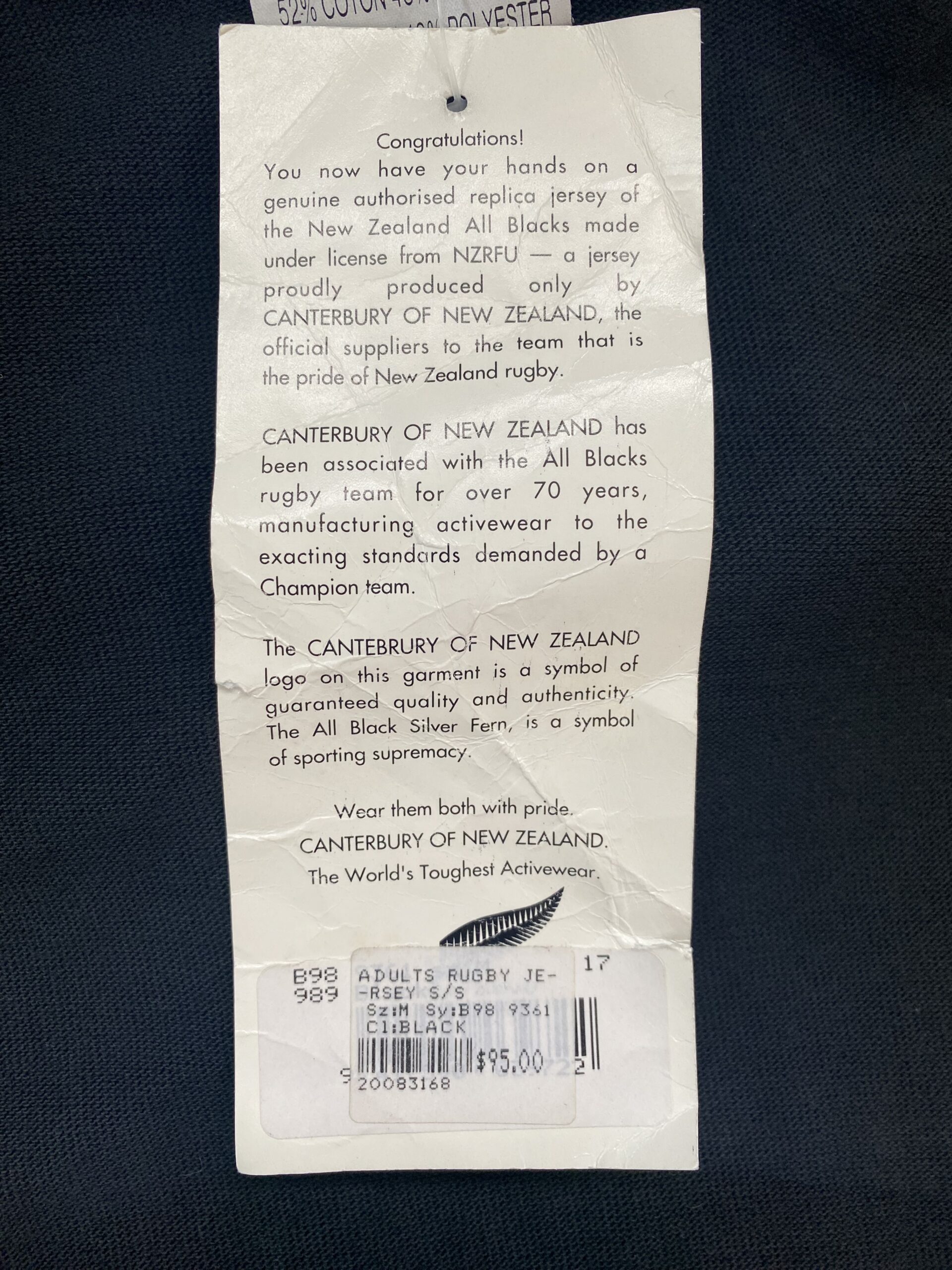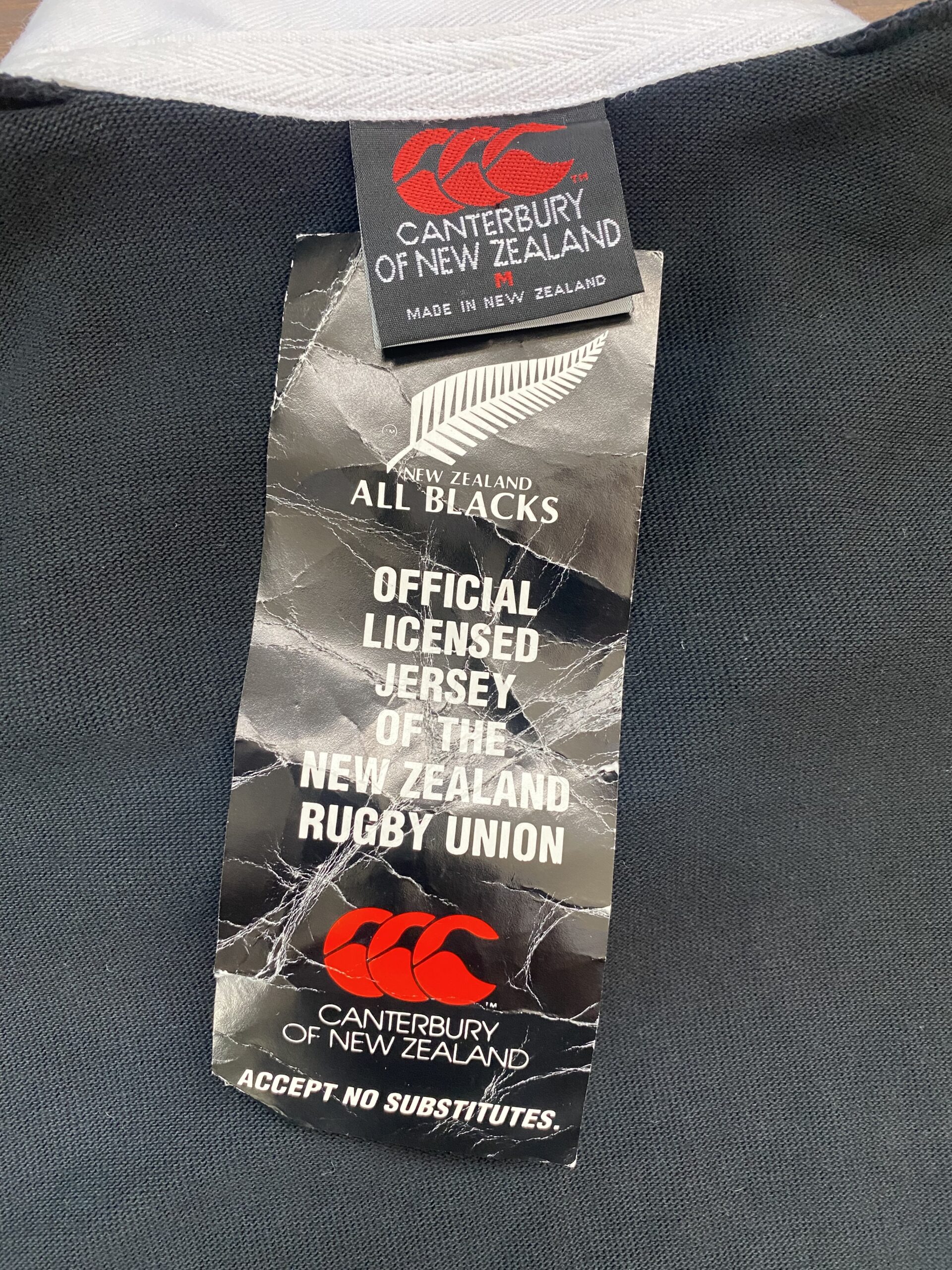 A rare 1993 All Blacks short sleeve rugby jersey, made by Canterbury (CCC) and still with the original tags attached — an incredible find over 30 years later. This was the final jersey design before the Steinlager sponsor logo first appeared in 1994.