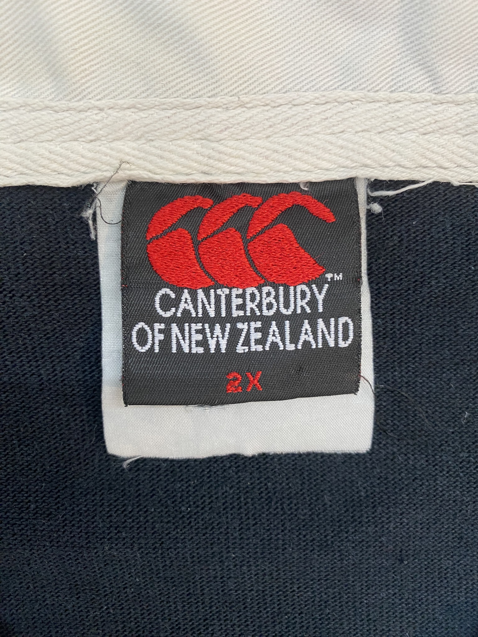 This 1993 New Zealand All Blacks long sleeve jersey is an authentic Canterbury of New Zealand release produced for the American market, identified by the distinctive 2X sizing tag commonly used on US-made rugby jerseys of the era. Jerseys from this period were manufactured in multiple countries, and this example is not a reproduction or fake, but a legitimate regional production run. What sets this jersey apart is the presence of white cuffs, a detail not typically seen on versions produced elsewhere, giving it a noticeably different look while remaining true to the classic early-1990s All Blacks design.