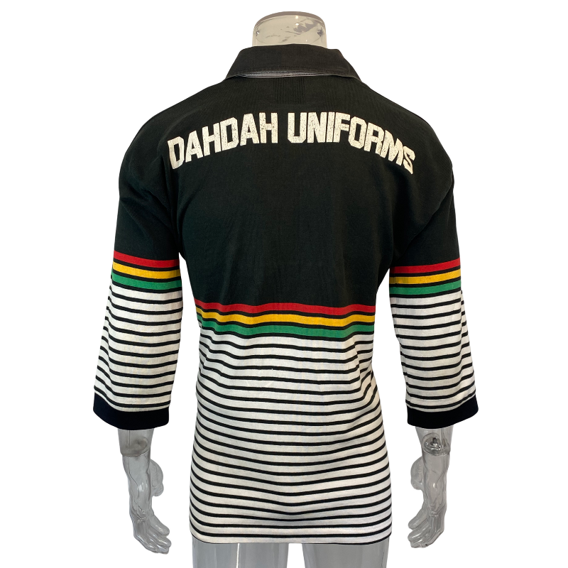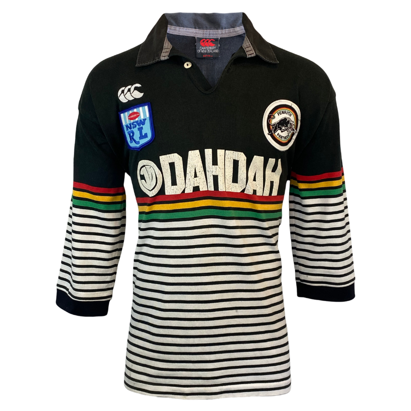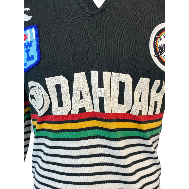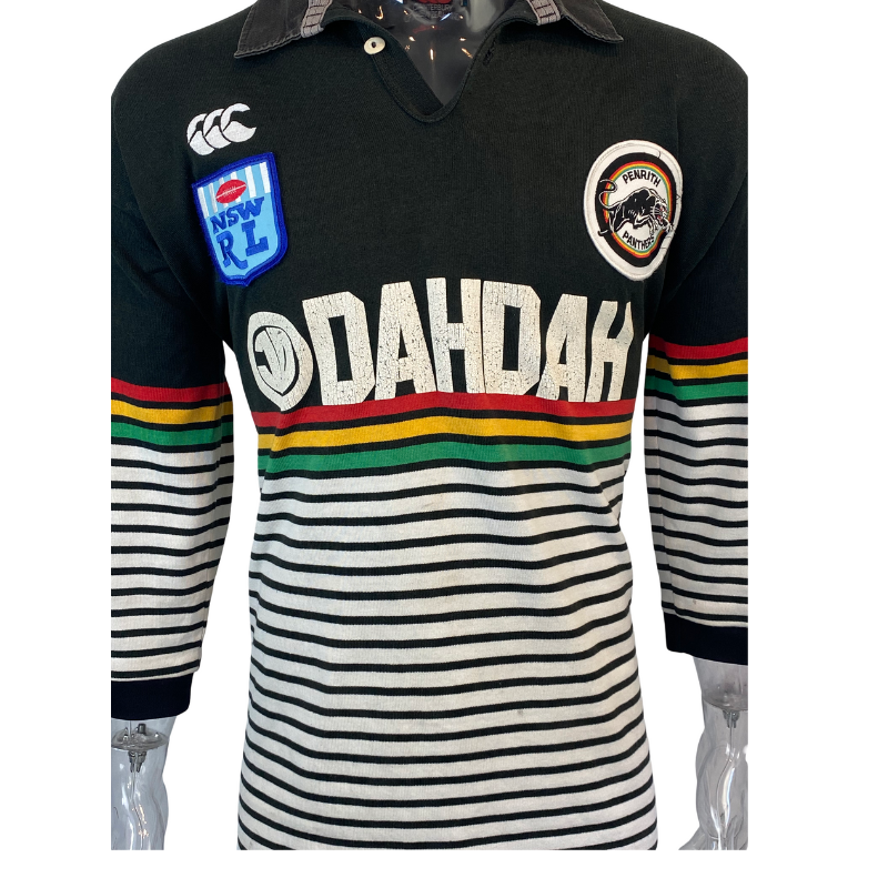 This Penrith Panthers jersey, renowned for its Dahdah front sponsor, is among the most iconic Panther’s jerseys. This three-quarter length jersey remains in good condition, despite some common cracking on the front logo and slight fading.
