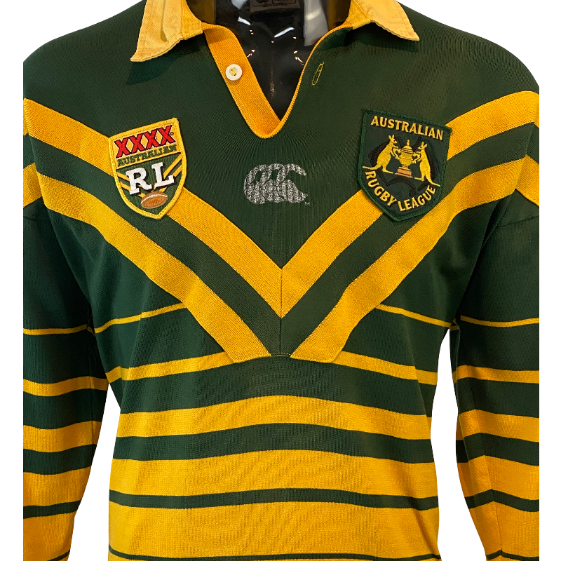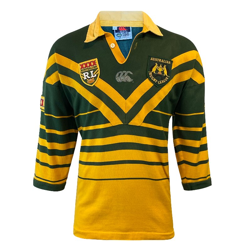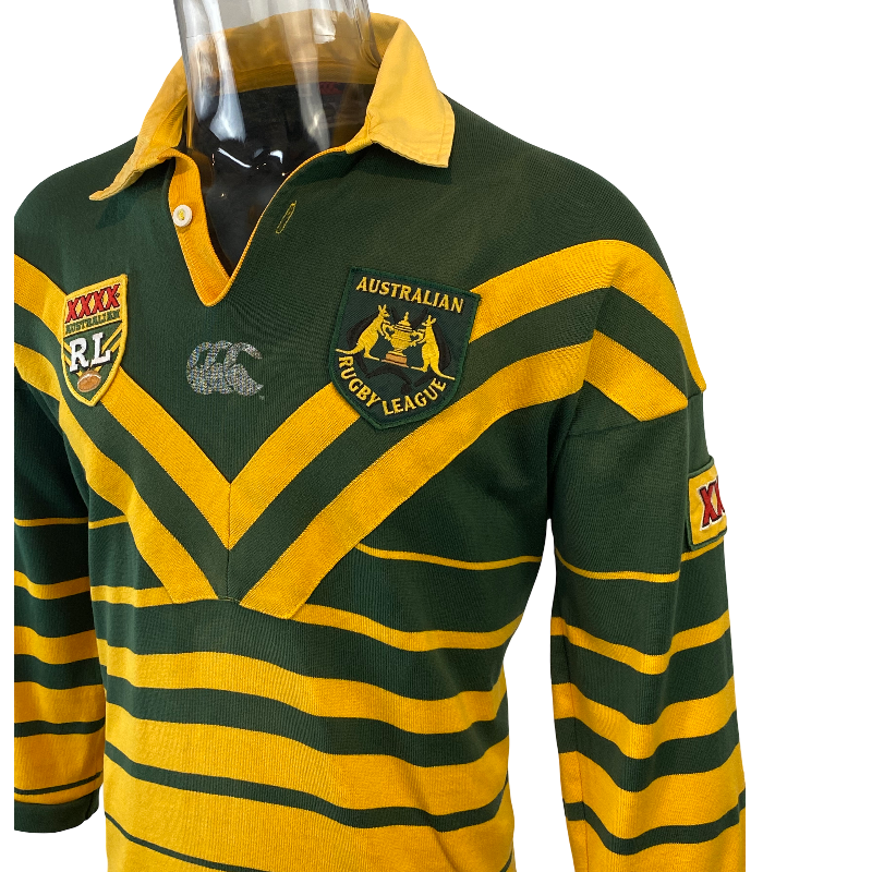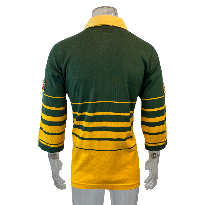 Here is a 1994 Australian Kangaroos Emu’s jersey. This is a very rare Canterbury of New Zealand jersey that mix’s the traditional green and gold colors for Australia. In popular 3/4 sleeve this jersey is in excellent condition. Tagged XL it fits Large to XL. A great jersey to add to the collection.