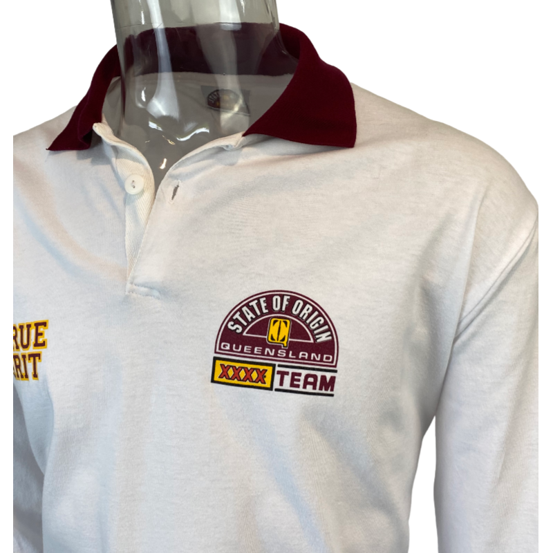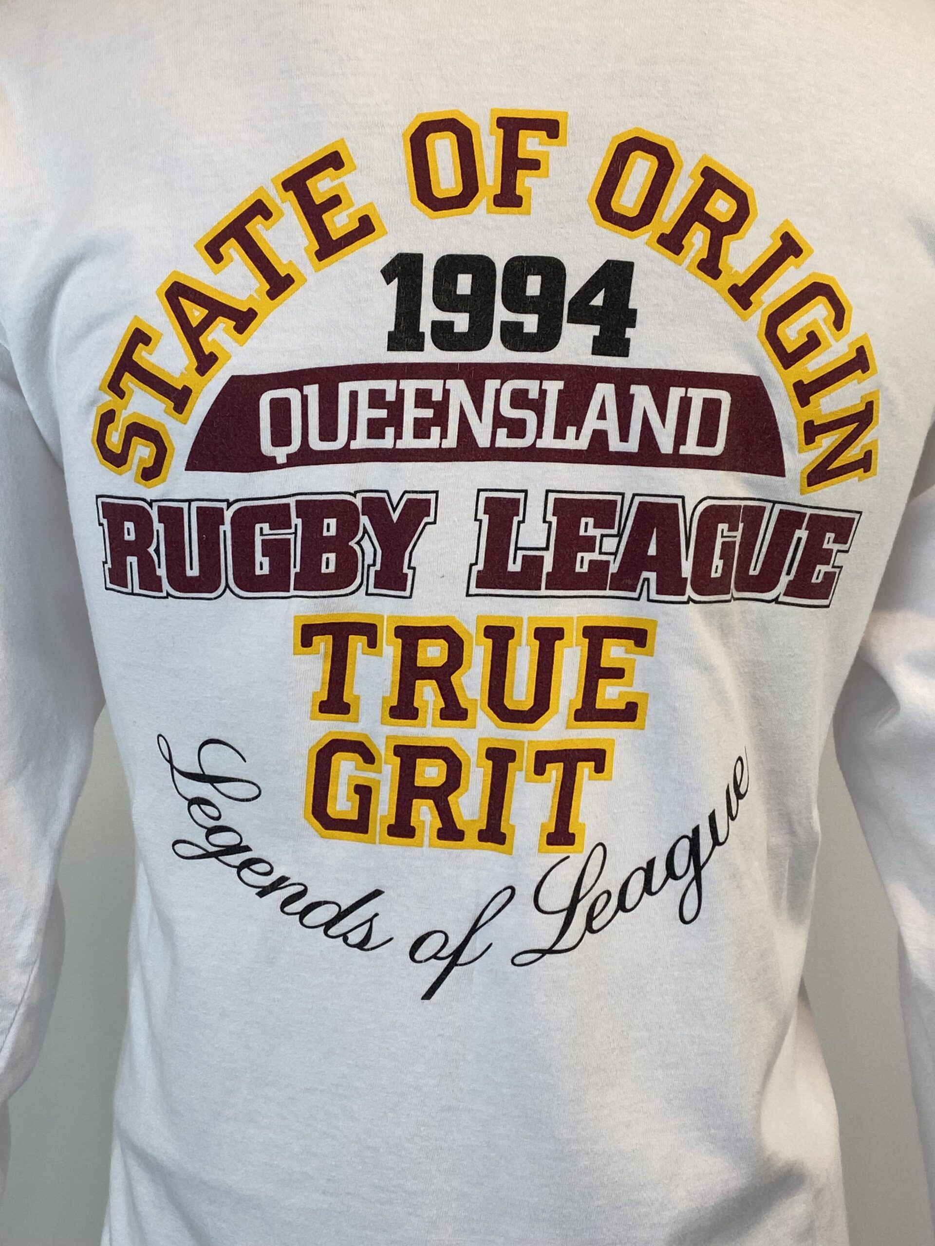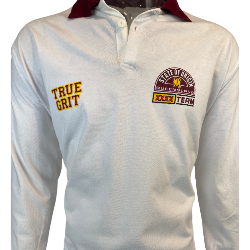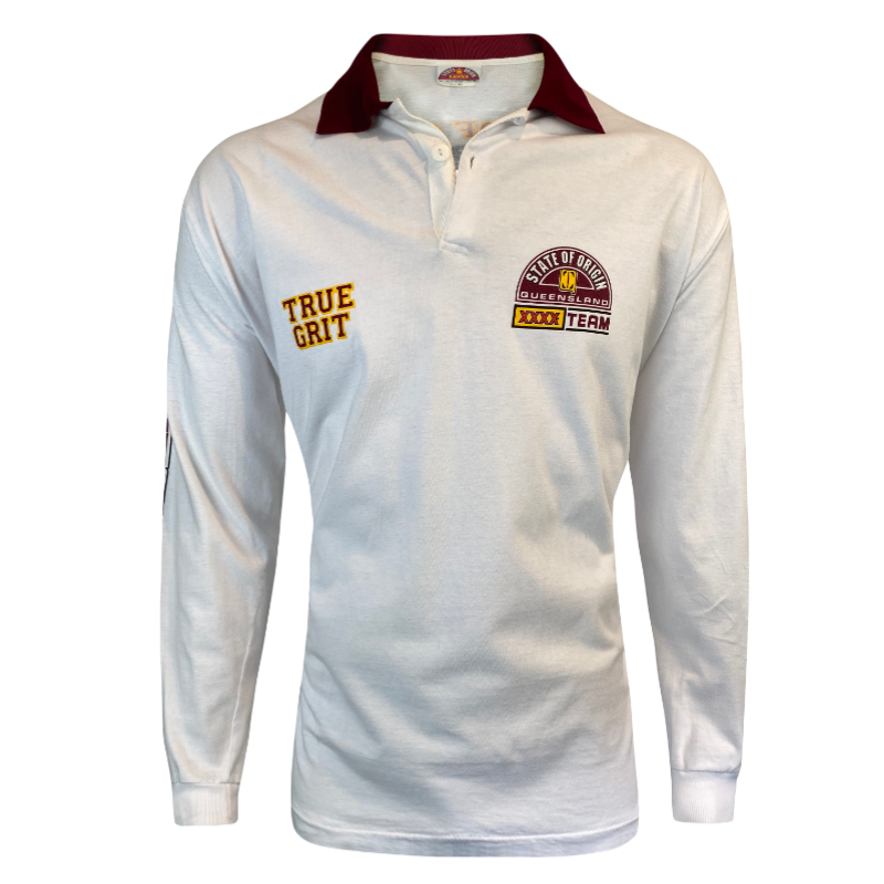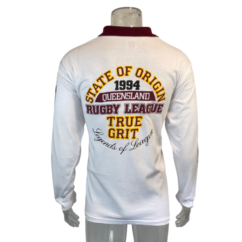 This is a 1994 Queensland Maroons supporters jersey. Made with 100% cotton the material of this jersey is more like a polo shirt as opposed to a heavy rugby jersey from this era. The back of the jersey has True Grit Legends of league and on the sleeves it has Queensland and Rugby League. A unique supporters shirt from back at the heights of iconic State or Origin series. The tag states Official Licensed product and the shirt is in new condition with no significant flaws.