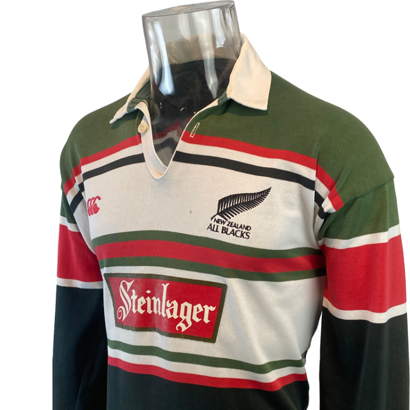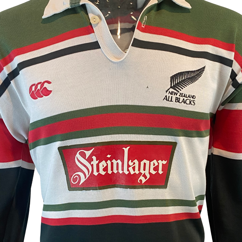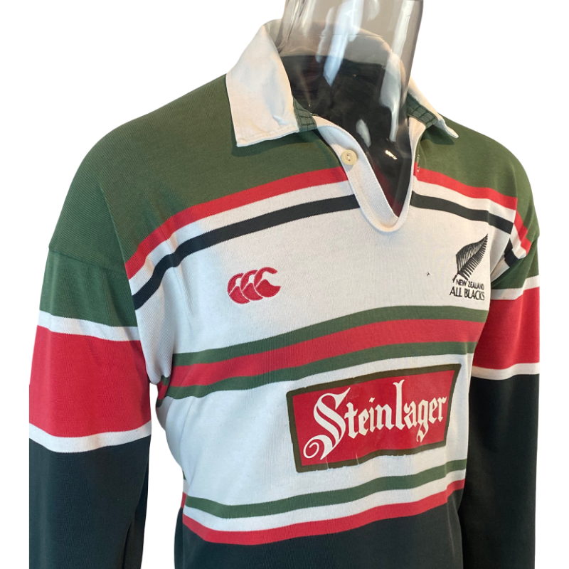 A classic from the mid-90s era of New Zealand rugby, this 1995 All Blacks training jersey features the iconic Steinlager sponsor across the front—one of the most recognisable partnerships in rugby history. Designed by Canterbury, it carries that traditional long sleeve cut with bold striped detailing, offering a more distinctive look compared to standard match jerseys from the era.