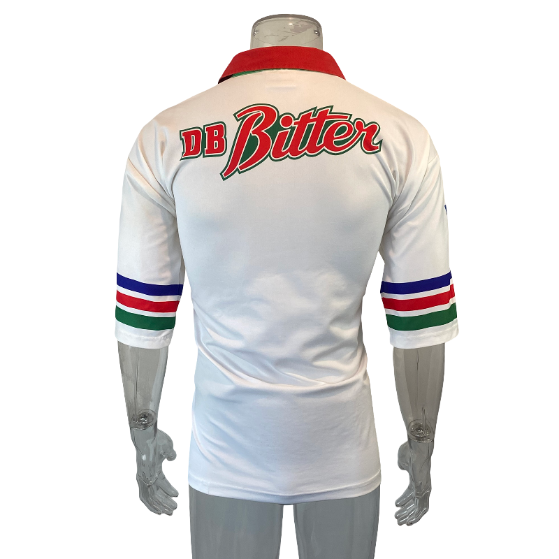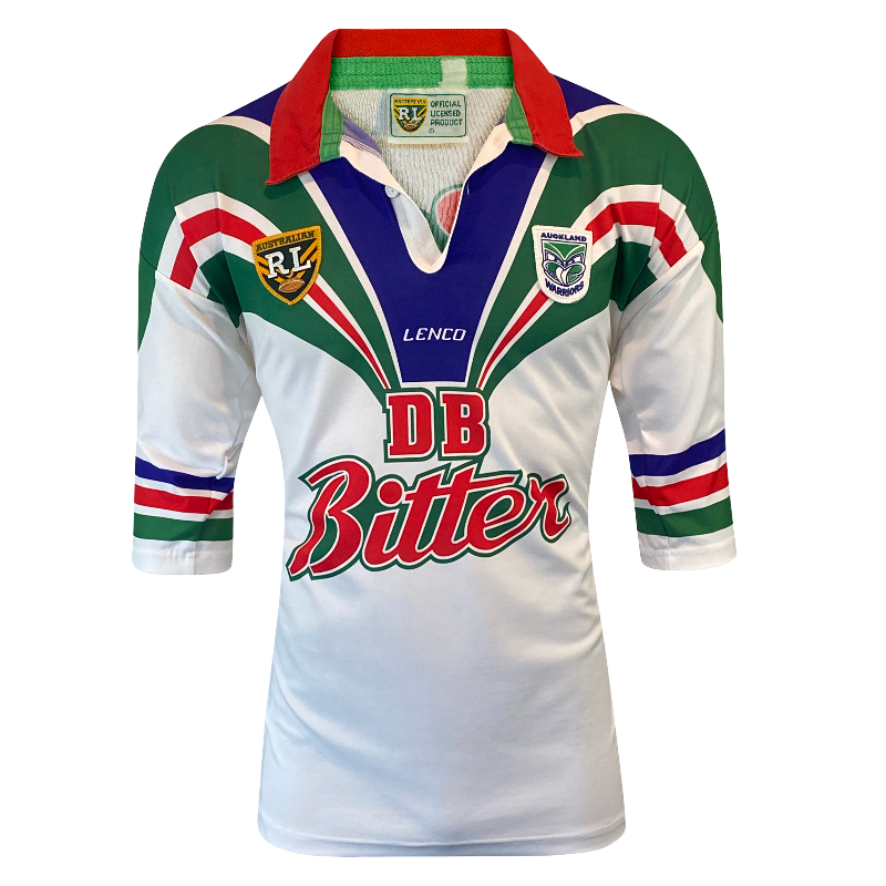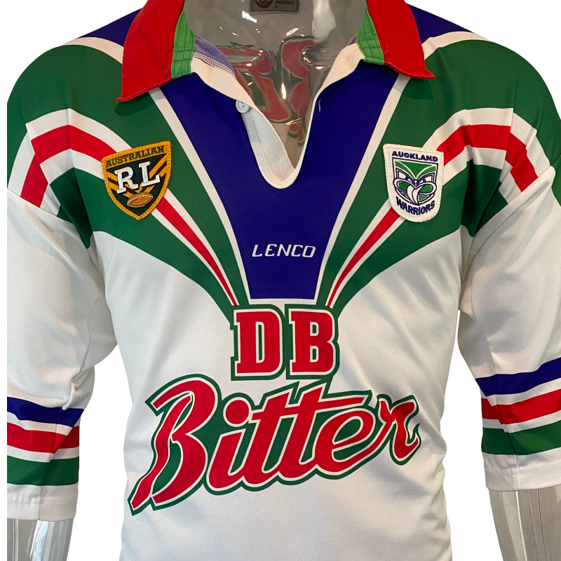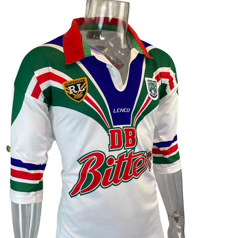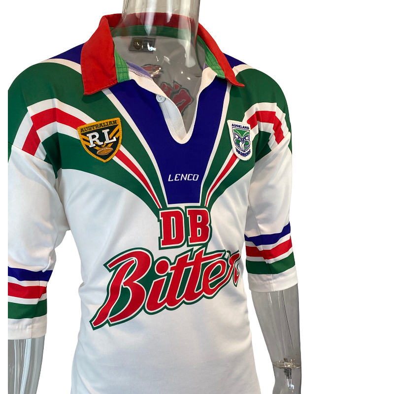 A stunning 1995 Auckland Warriors jersey by Lenco, released in the club’s inaugural season in the ARL. This white away version was frequently worn on the road and has become one of the most iconic and sought-after designs among the fiercely loyal Warriors fan base. Featuring the bold and unmistakable DB Bitter sponsor across the front — one of the most memorable front-of-shirt logos of the era — this jersey captures the energy and excitement surrounding the birth of the franchise in 1995.
