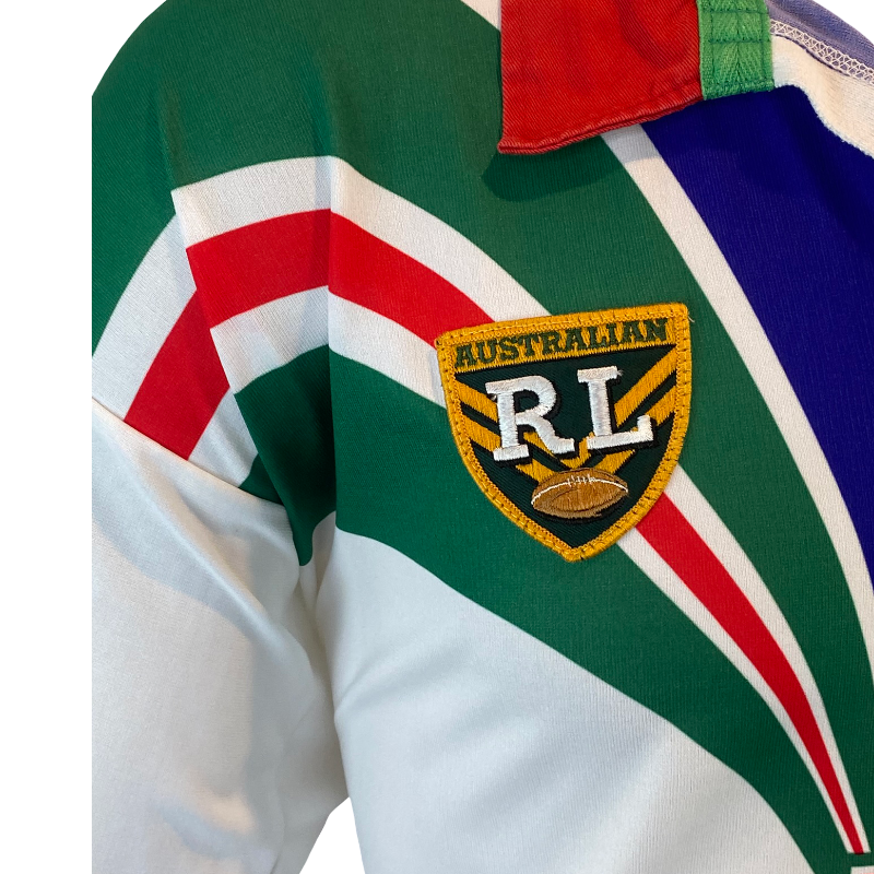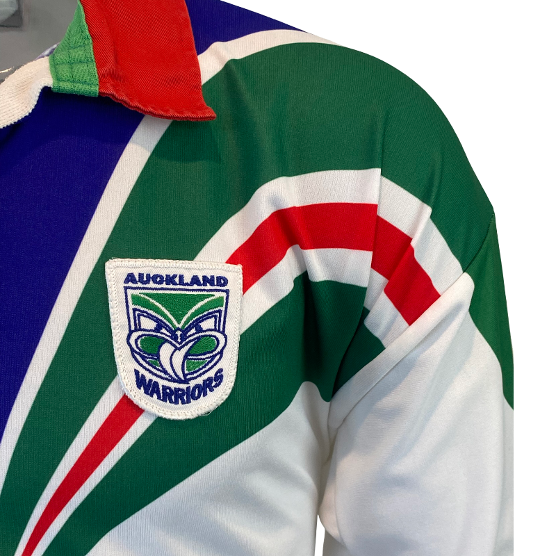 Constructed from lightweight polyester typical of mid-90s ARL kits, this example is presented in excellent condition with no pulls, which is uncommon for jerseys of this age. The ARL and Warriors chest patches appear slightly smaller than other versions produced, adding an interesting variation detail for collectors. The size tag has faded, but it fits approximately Medium and could suit up to a Large. A truly iconic foundation-season Warriors jersey and a must-have for serious supporters and rugby league collectors alike.