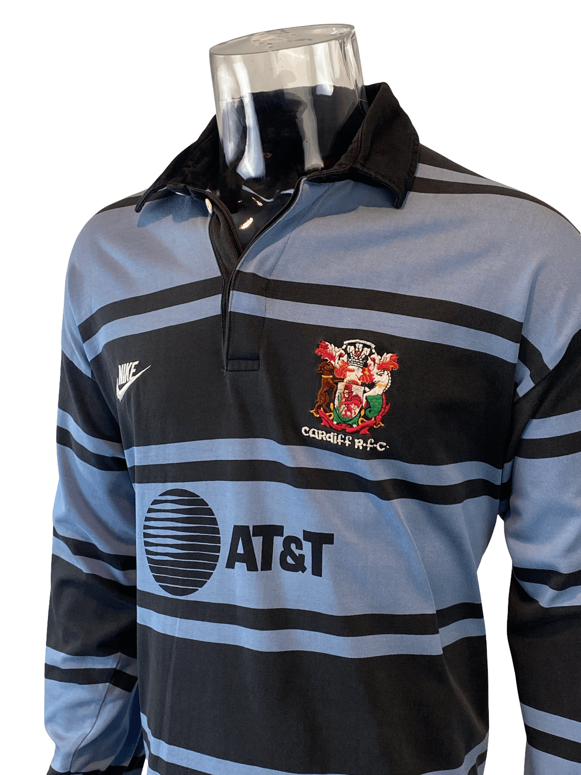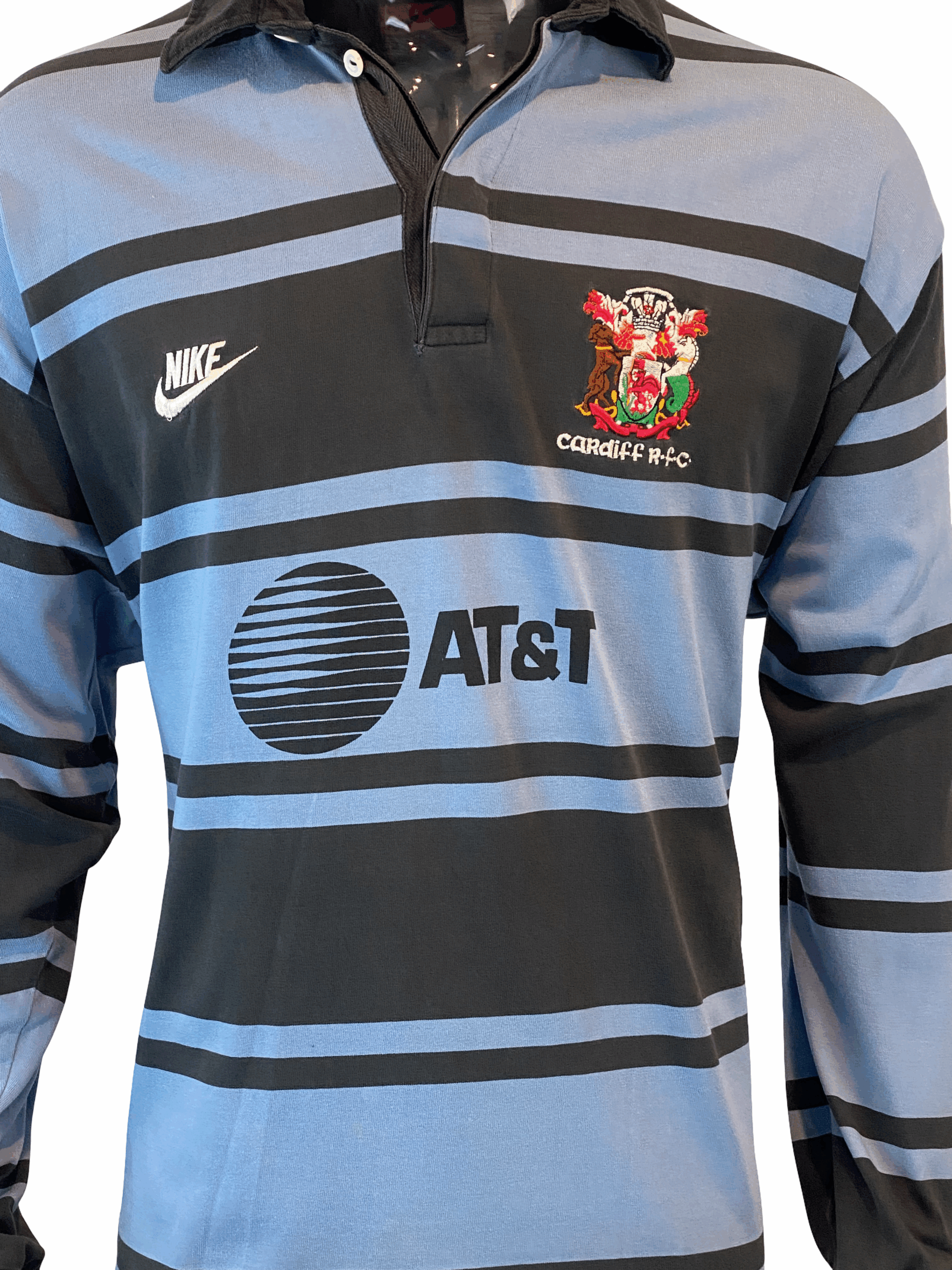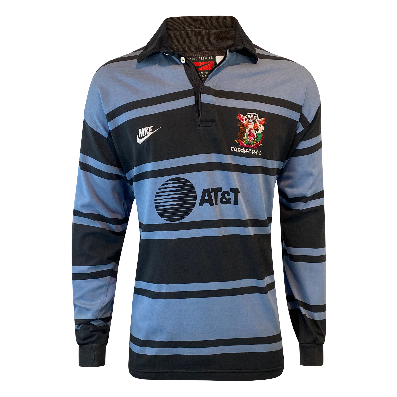 Showcasing the traditional Cardiff colours, it features the iconic old-school Nike logo on the chest alongside the AT&T sponsor logo across the front. Like many Nike rugby jerseys of the era, it is made to a high standard with timeless styling.