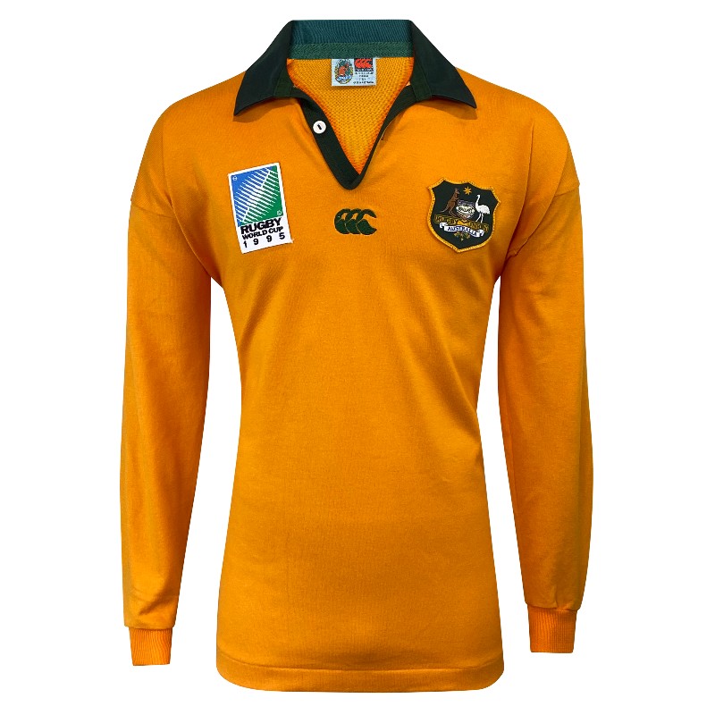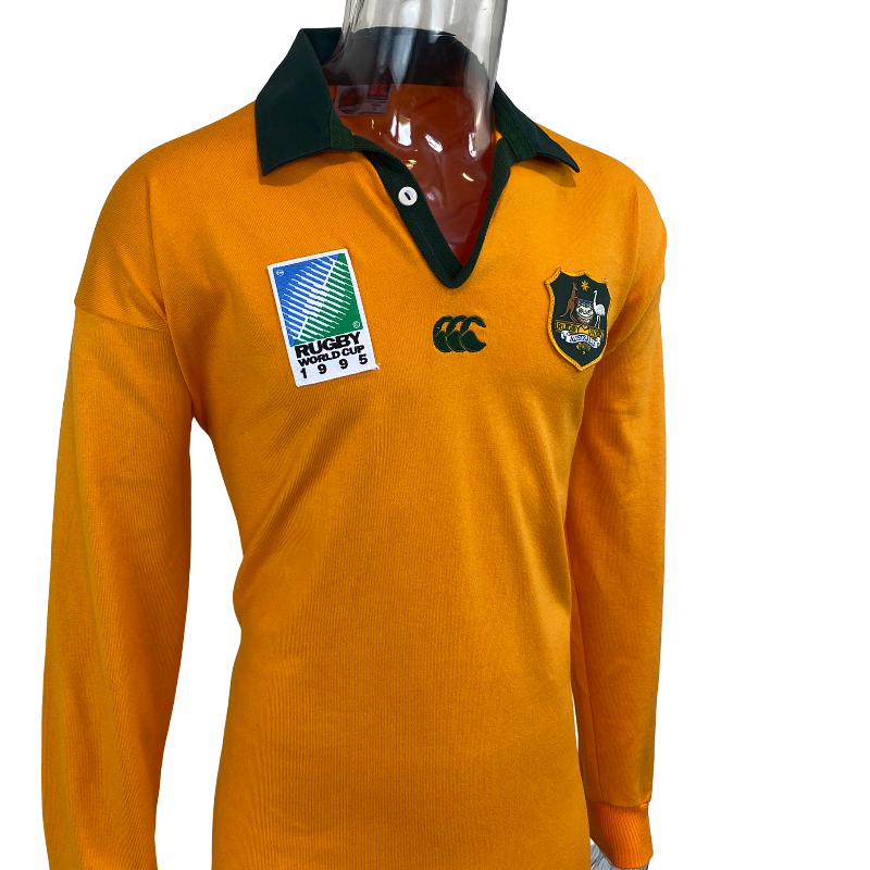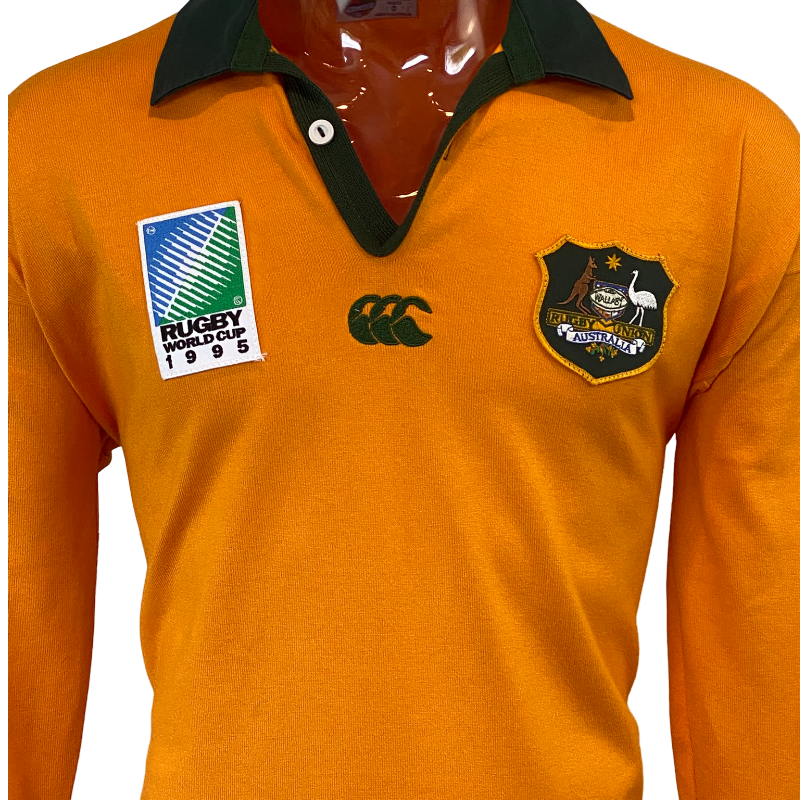 The iconic Australia Wallabies 1995 Rugby World Cup jersey, produced by Canterbury of New Zealand and made in Australia. This classic long-sleeve design was worn during Australia’s 1995 World Cup campaign and remains one of the most sought-after Wallabies jerseys.
