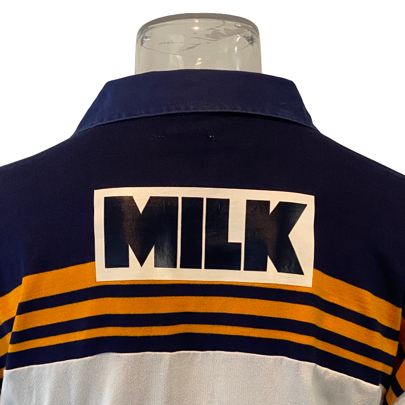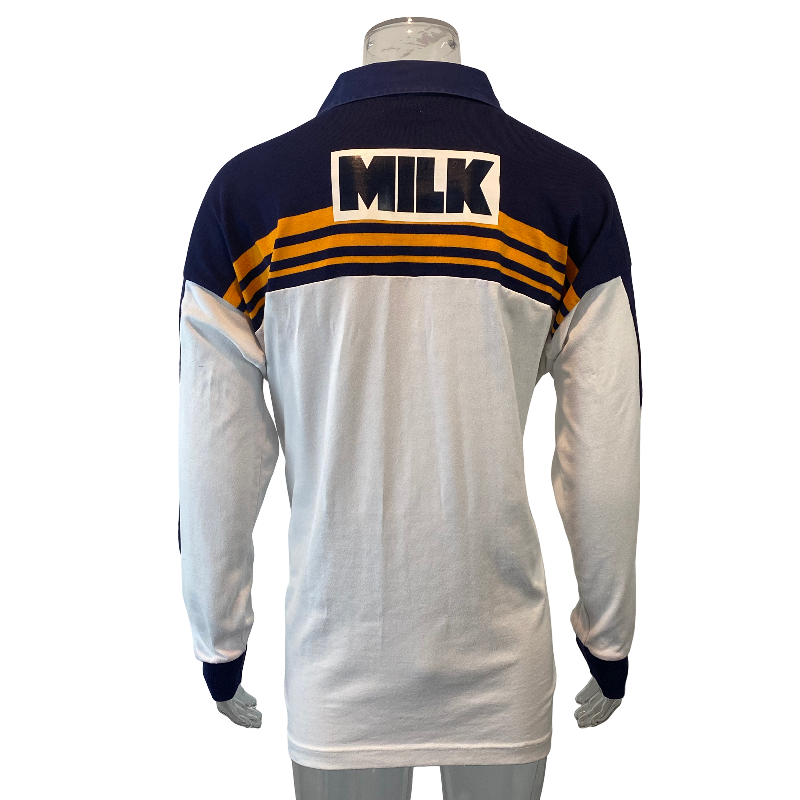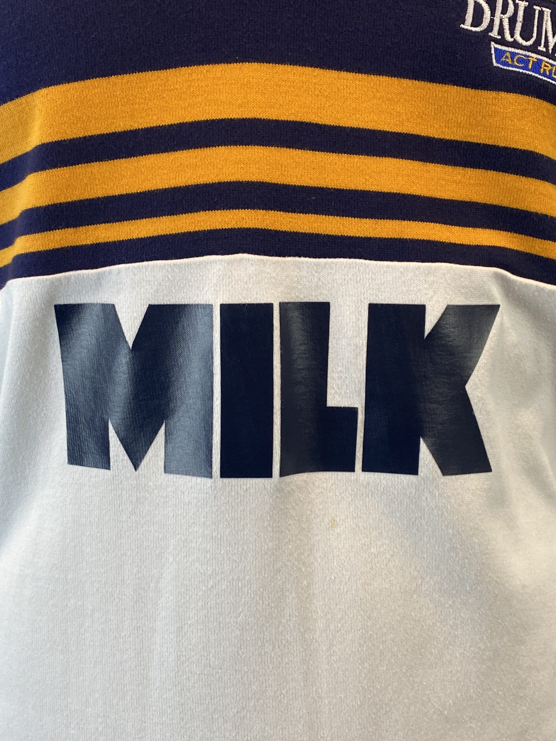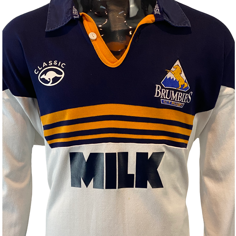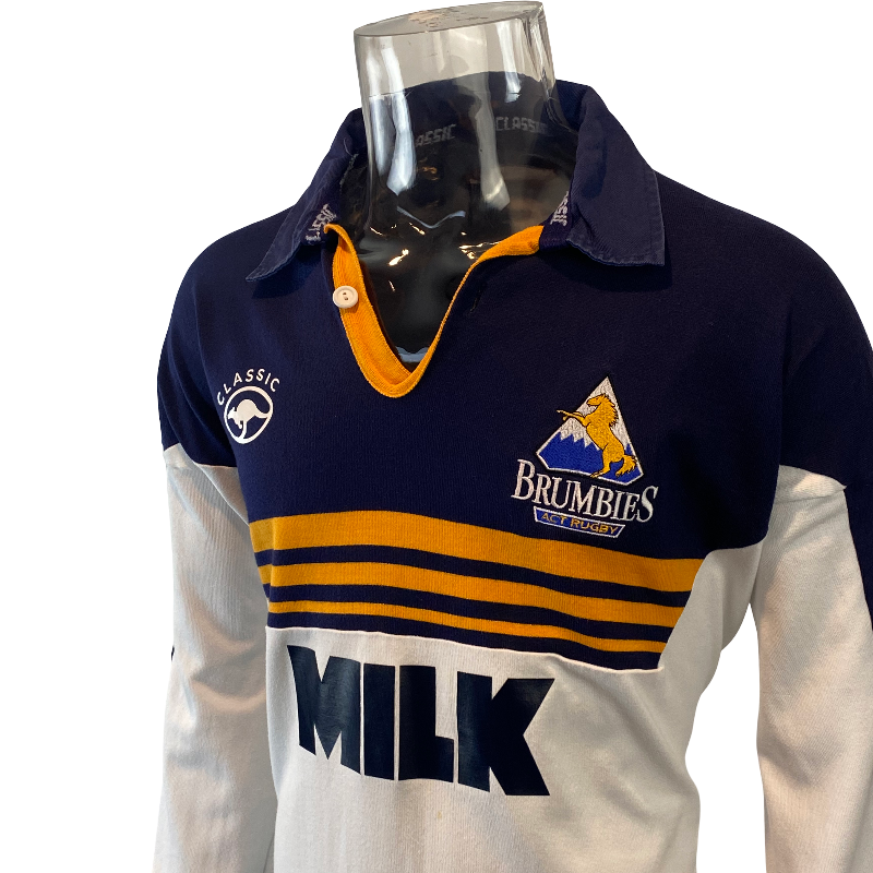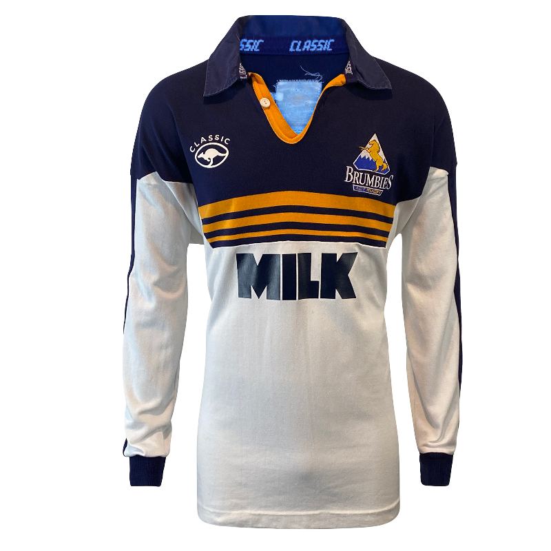 An absolutely iconic piece of Brumbies history. This incredibly rare 1996 ACT Brumbies long sleeve jersey was produced by Classic and features the unforgettable MILK sponsor logo boldly across the chest.