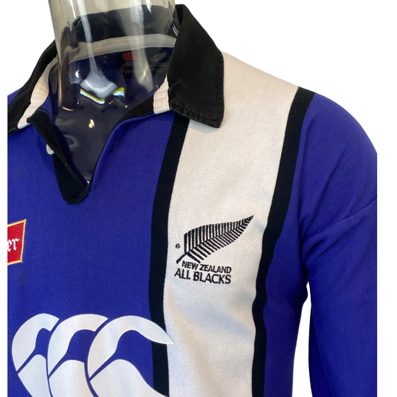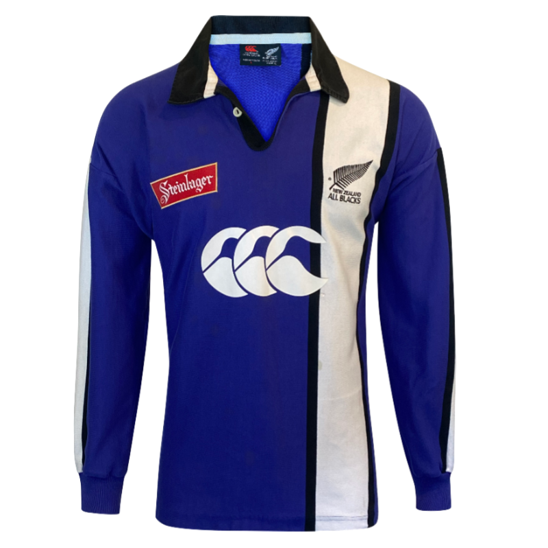 Up for grabs is this unique 1997 All Blacks training jersey in long sleeve. A popular training jersey featuring the Canterbury of New Zealand CCC logo on the front as well as the Steinlager logo. The jersey is in very good condition. The only flaws are some light staining on the front of the jersey however this is very faint and has improved with washing. A picture has been included to try capture this so please review. Tagged Large this jersey fits true to size.