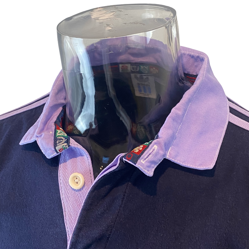 A hugely popular design among collectors, this jersey represents the quality and simplicity of late-90s Adidas craftsmanship. Please note that this example has experienced dye run from the navy body onto the white collar and three stripes, a common issue with this release that was worsened by a warm wash. As a result, the collar and stripes have taken on a light purple tone. Please review all photos.