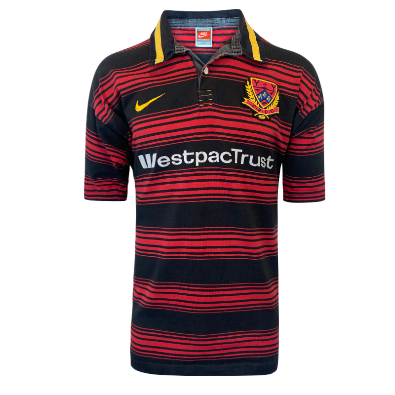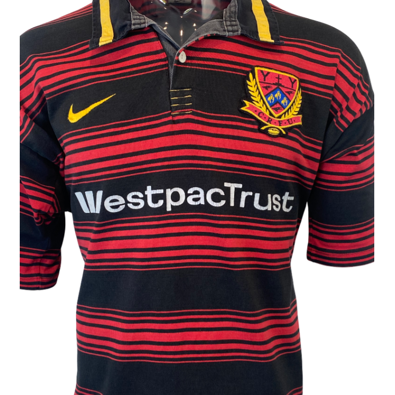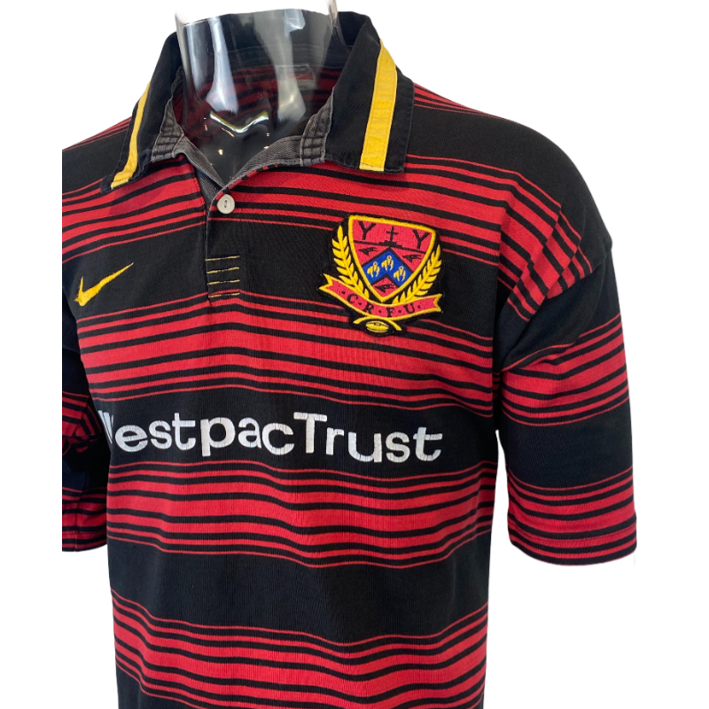 Here is your chance to score a 1997 Canterbury Rugby jersey as worn during the NPC. Made by Nike these 100% Cotton jerseys are super high quality and incredibly popular. This jersey has minor wear on the WestpacTrust logo but otherwise is in excellent condition. Heavy Duty and ready to wear. While the jersey is tagged XXL with a pit to pit of 56cm really fits a big medium to a large.