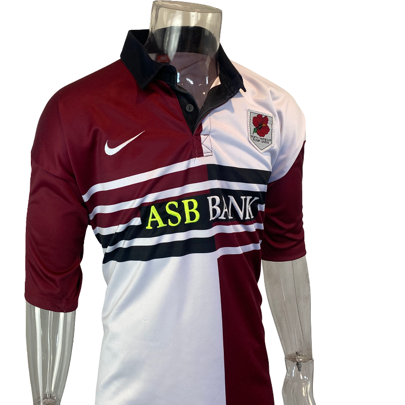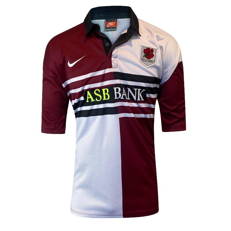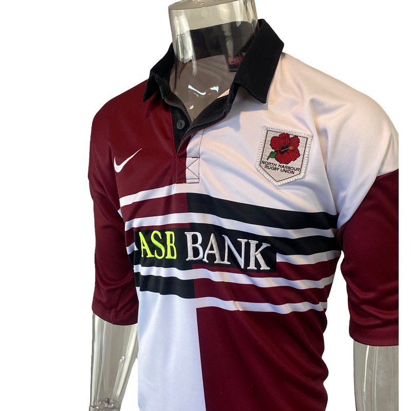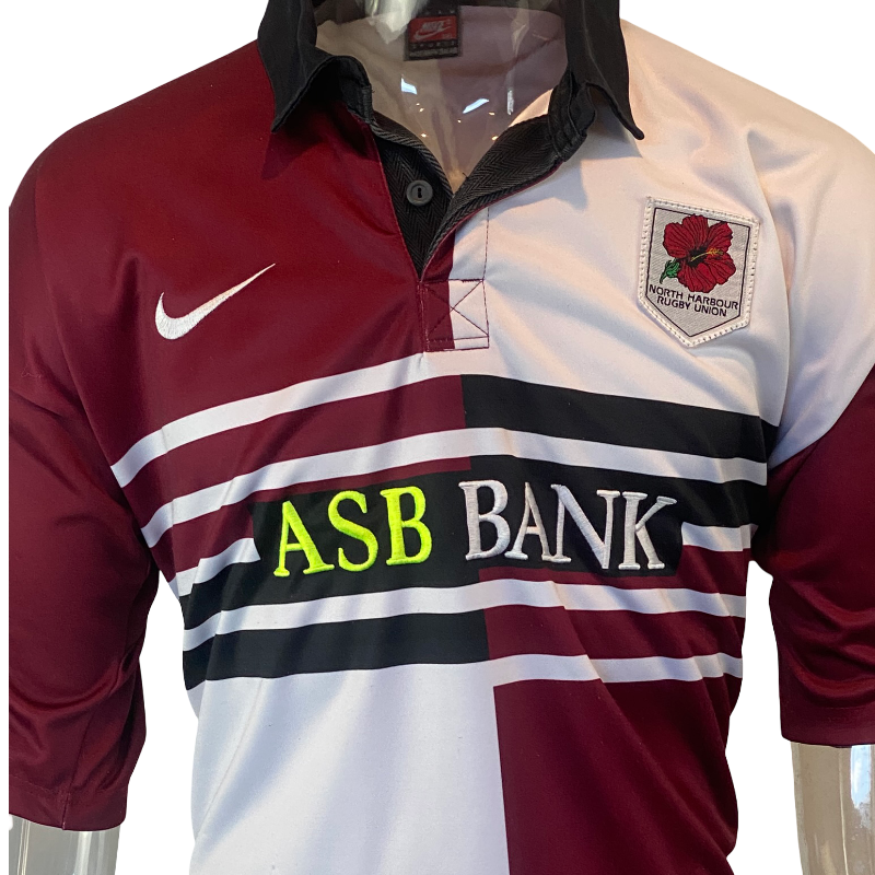 A true New Zealand provincial classic — this 1997 North Harbour rugby jersey by Nike captures the bold look and feel of late-90s NPC rugby. Made in New Zealand by Lenco on behalf of Nike, it features the stitched ASB Bank sponsor logo on the front and the club’s famous black, white, and maroon colours.