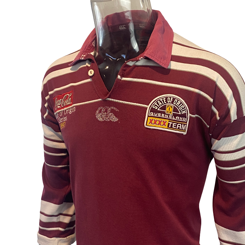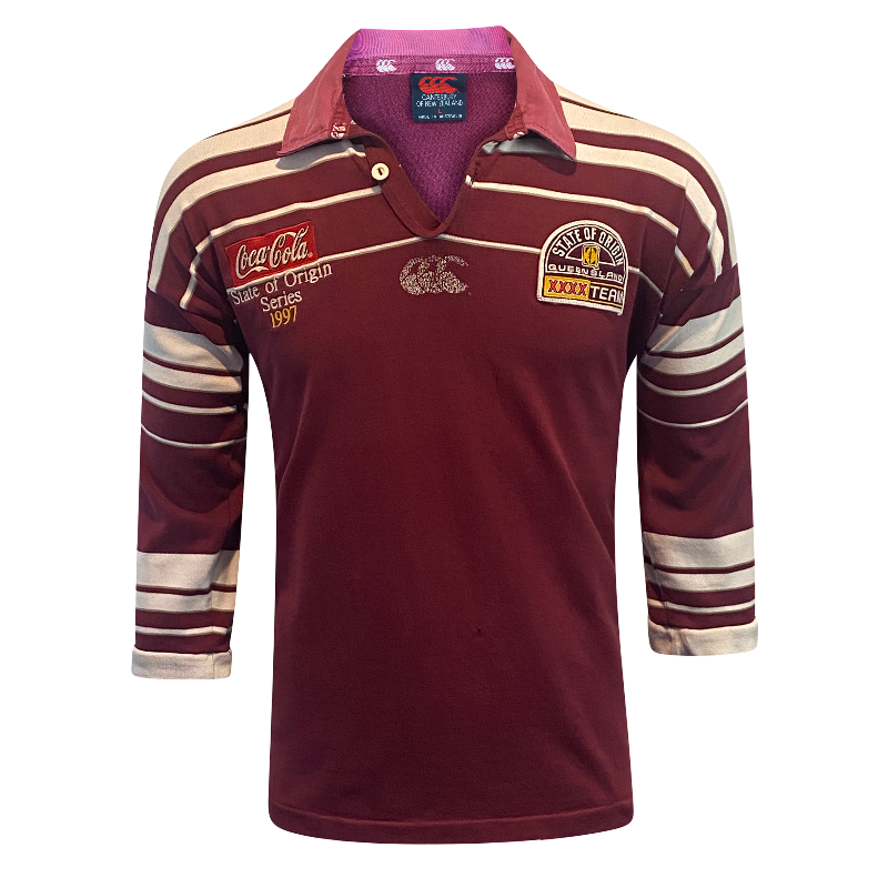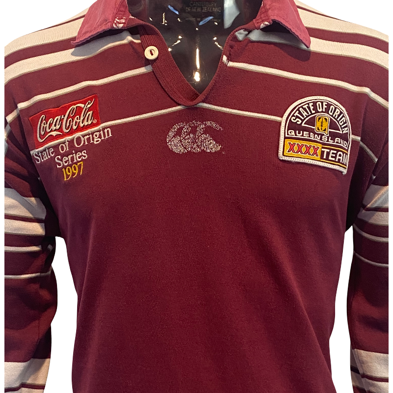 A rare 1997 Queensland Maroons State of Origin rugby league jersey, made by Canterbury of New Zealand. This impressive design features the special Coca-Cola 1997 State of Origin Series embroidery, making it a standout piece for fans and collectors.