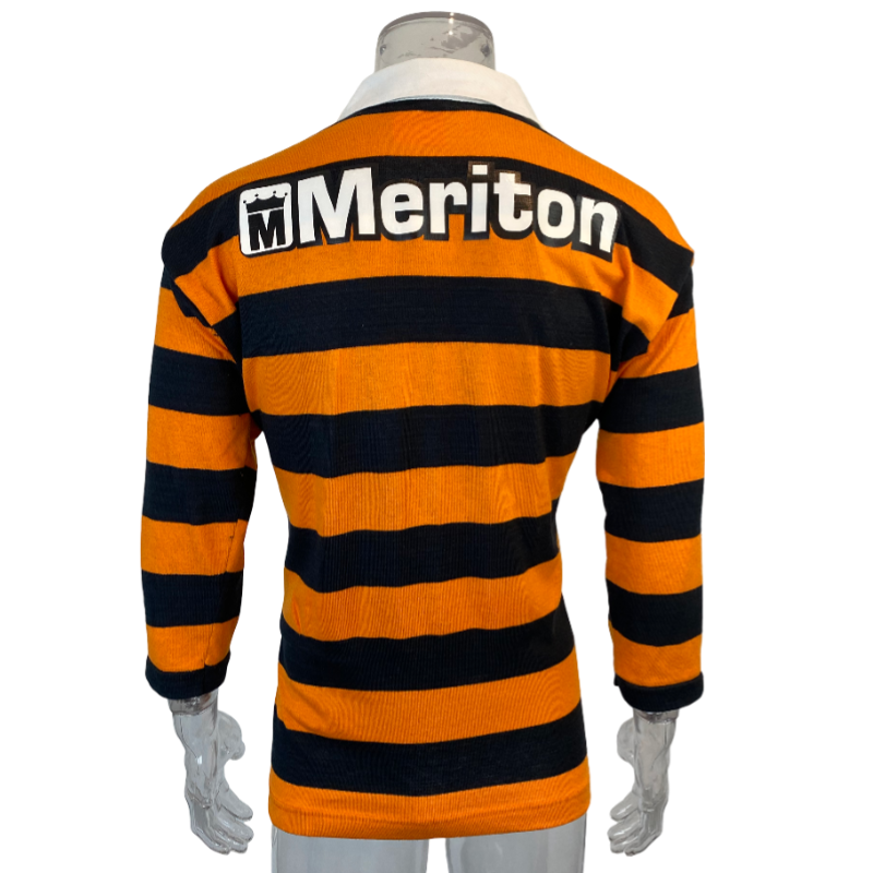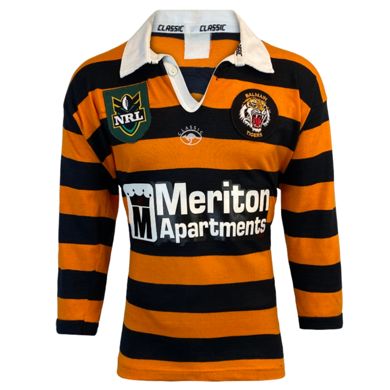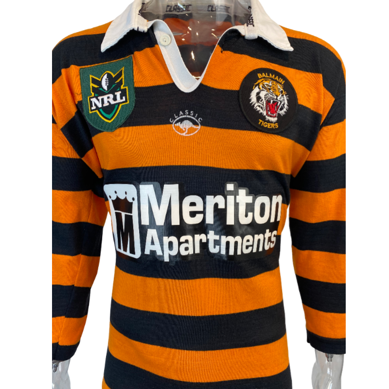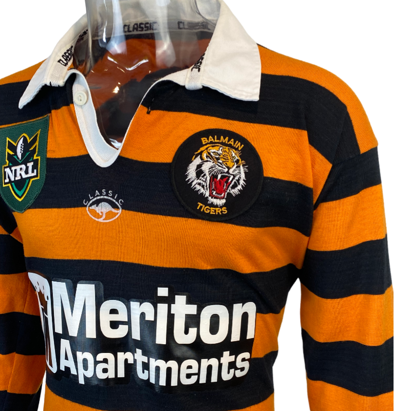 This 1998 Balmain Tigers jersey is hugely popular with a passionate fan base. A timeless classic jersey with a awesome design and color combination. Made by Classic this jersey is in excellent condition. The front and back logos are in pristine condition. Here is your chance to score a unique Balmain Tigers jersey. The sizing on the tag has faded but fits a modern day Medium.