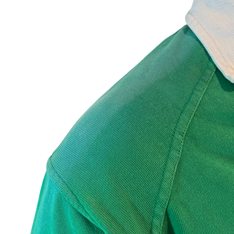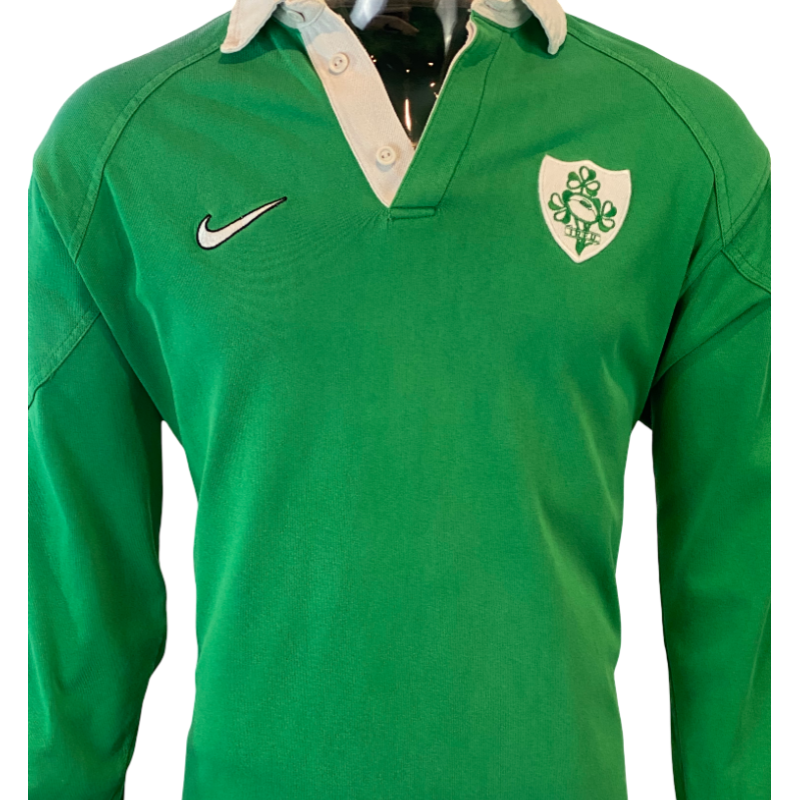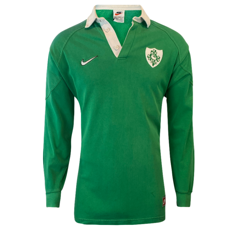These 1998 Ireland Rugby Jerseys made by Nike are hugely popular. Nike made some impressive 100% Cotton rugby jerseys and these jerseys seem to be incredibly popular with a passionate Irish fan base. Featuring the Nike tick and free of a front jersey sponsor. The body of this jersey is in excellent condition with only flaw being the right shoulder of the jersey has faded, this is most likely due to being hung in a closet but sunlight getting in. Otherwise this jersey is good to go now. A perfect jersey to absorb the tears of a 2027 Quarter Final.