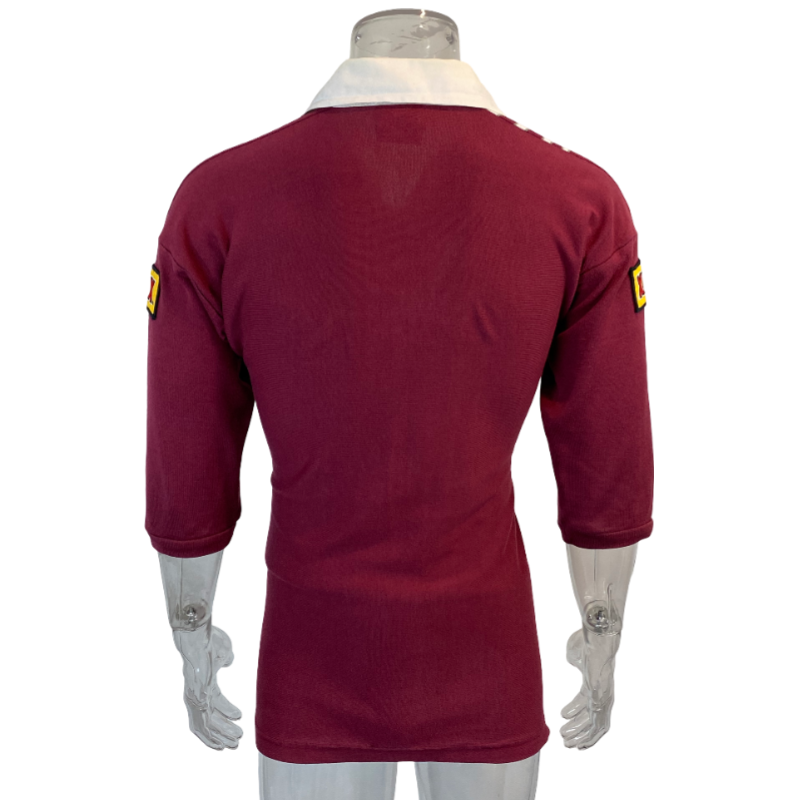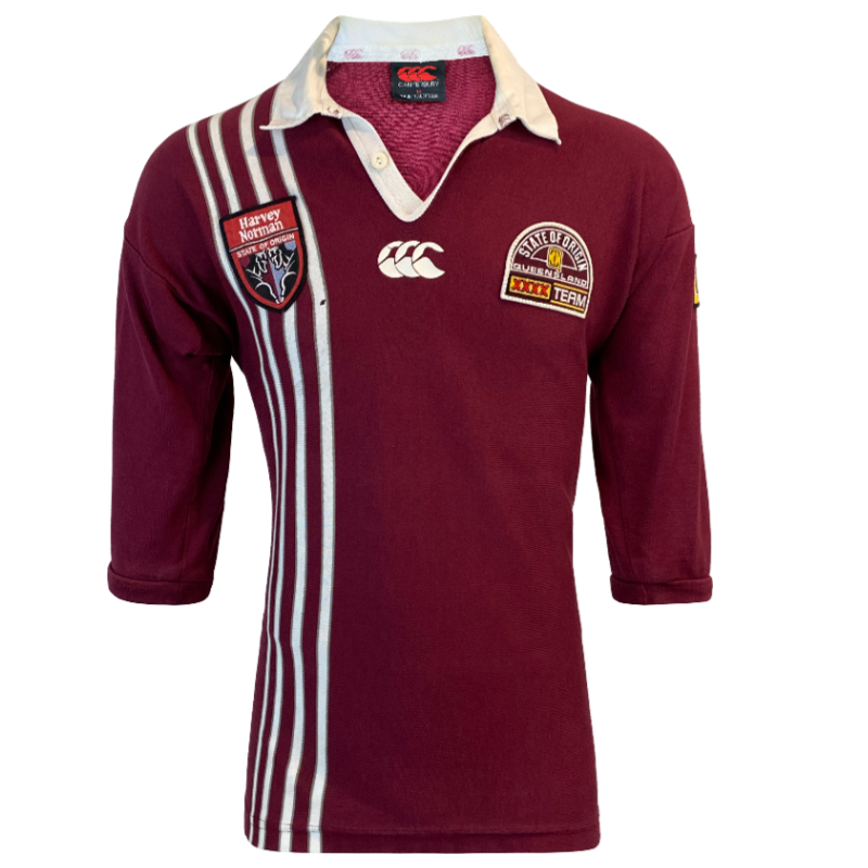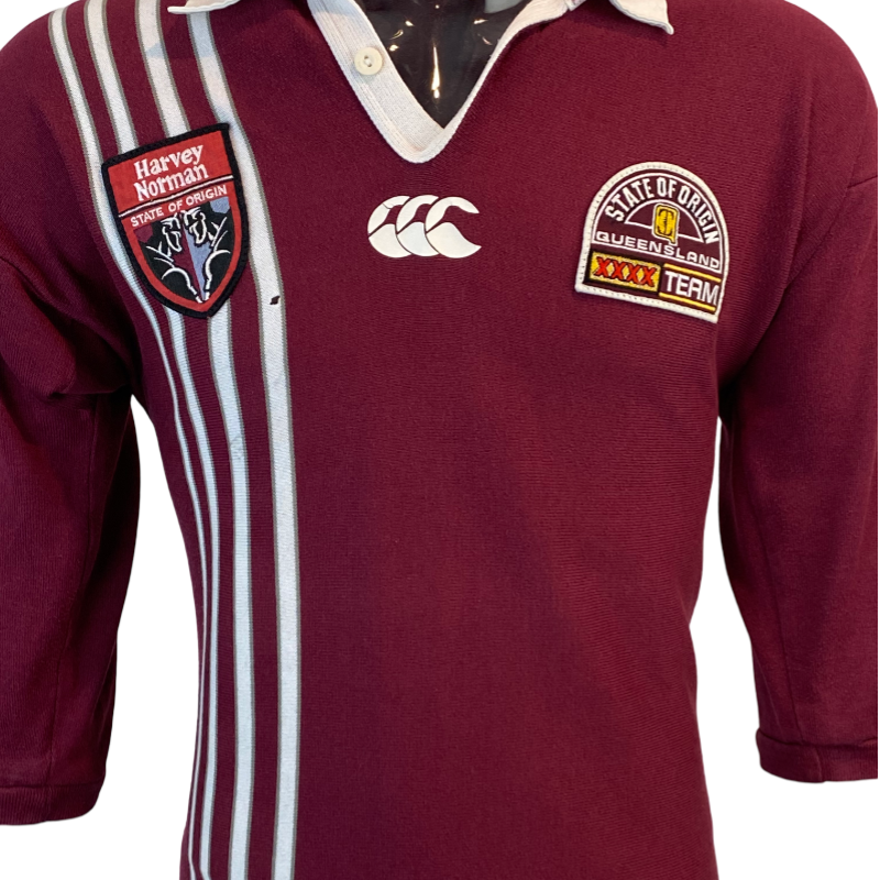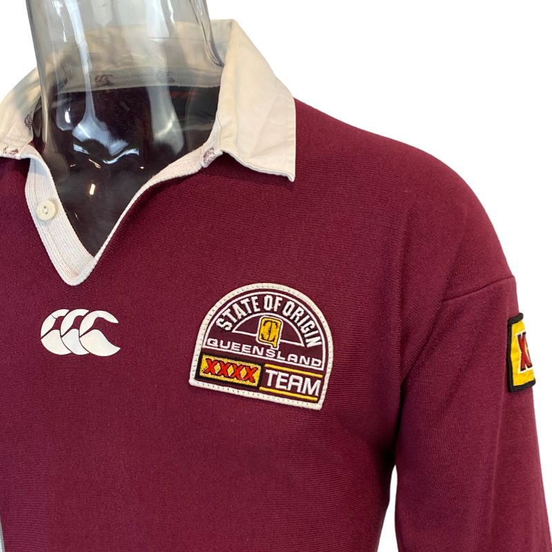 Here is the classic 1998 Queensland Maroons jersey. This State of Origin jersey is one of the more popular Queensland designs. Featuring Harvey Norman and XXXX logos stitched into the jersey. The body of the jersey is excellent, however does have one small hole on the front. The collar has lost its shape a bit but overall the jersey is still in very good condition.