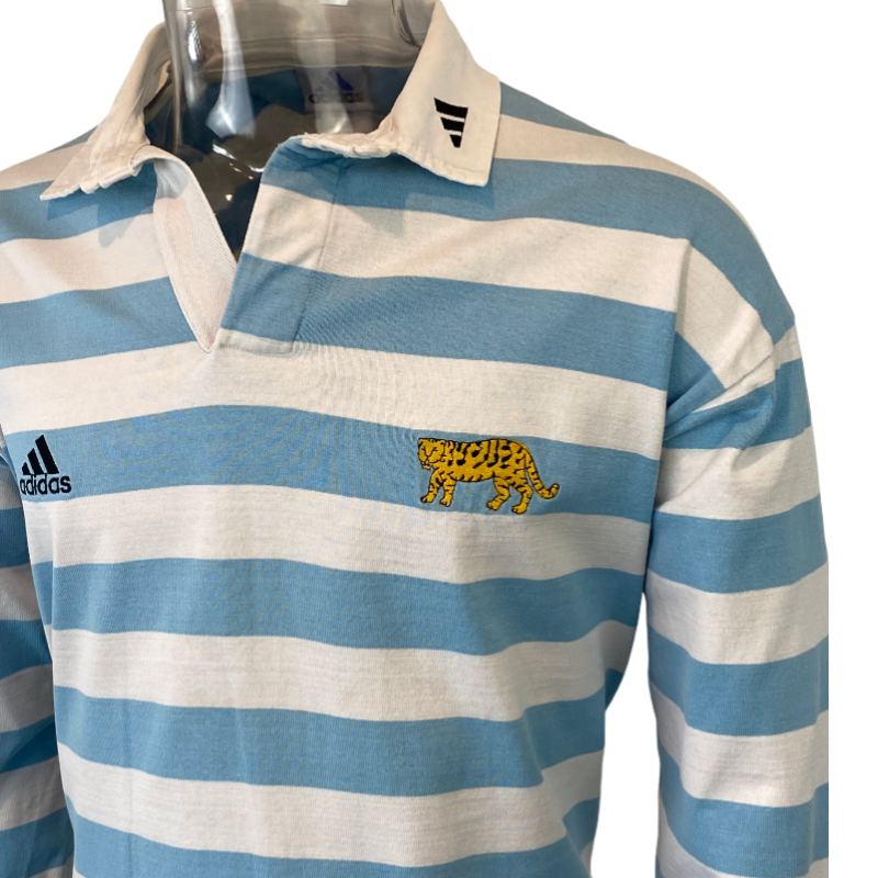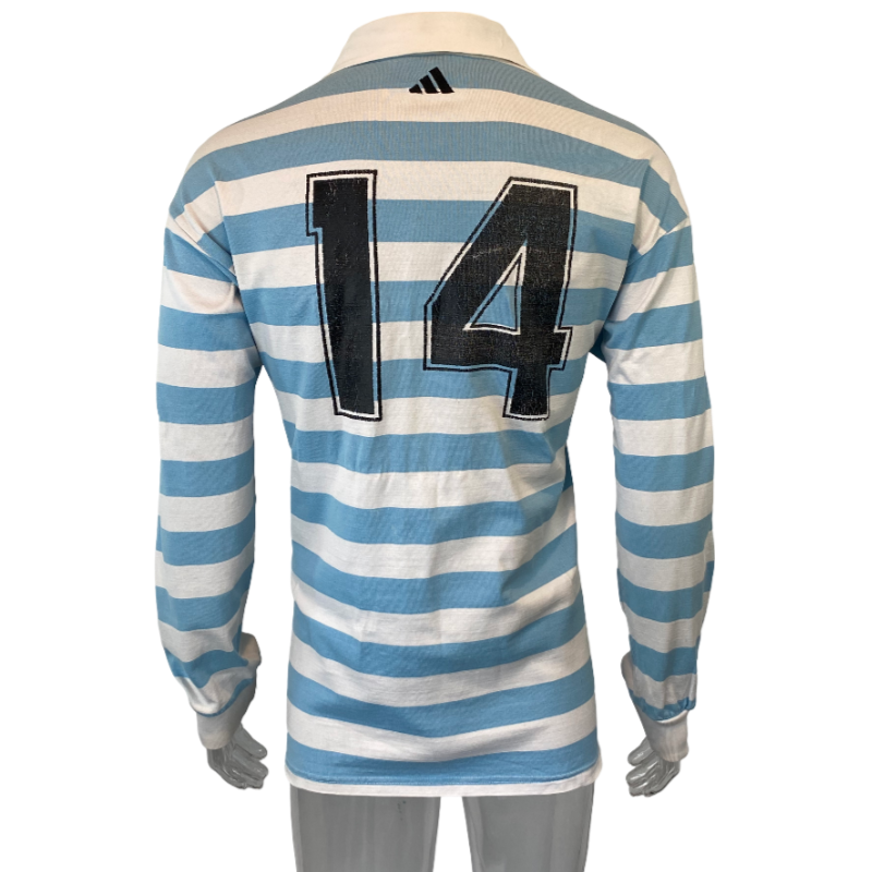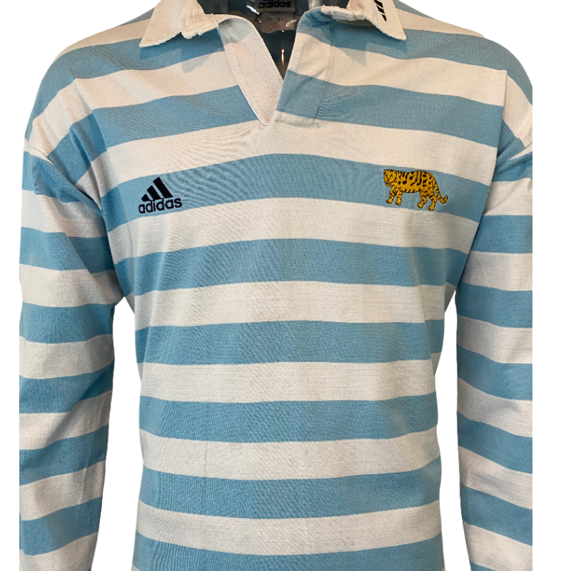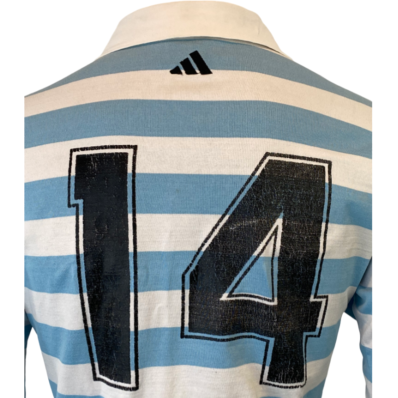 Here is a 1999 Argentina Puma’s jersey. Made by Addias and in Argentina it does have number 14 on the back however we cannot confirm if it is a player’s jersey. If it is a player’s jersey it is most likely Argentina A or a mid-week non test jersey due to the Puma logo as opposed to the traditional test logo. Made in Argentina it is a sharp looking high-quality jersey. The number 14 on the back is showing some signs of wear but otherwise this classic jersey is in very good condition.