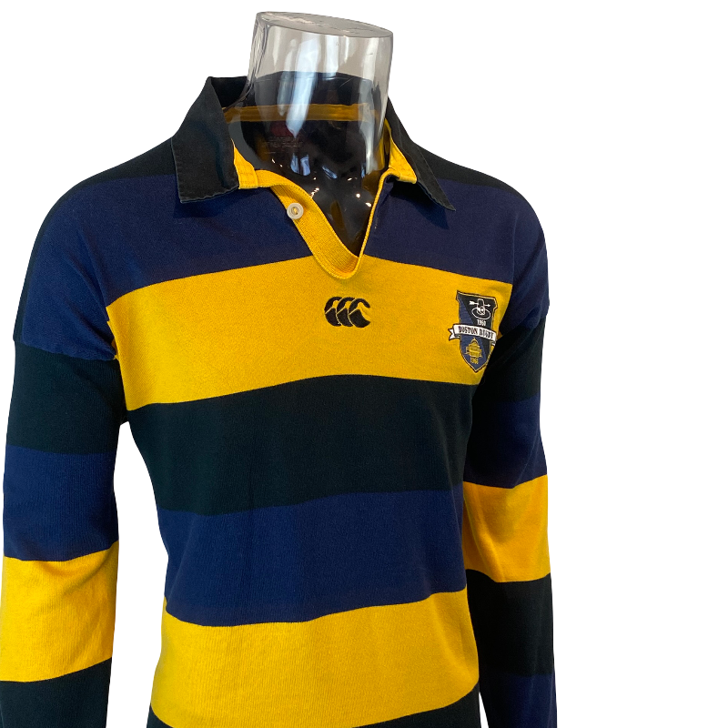 This jersey captures that identity perfectly. In classic navy and gold hoops with the old-style Boston crest (featuring the Pilgrim hat, muskets and the State House dome), it represents the era when CCC dominated global rugby kit. The heavyweight cotton, deep placket and traditional collar make it a dream jersey for Canterbury collectors, and original CCC American club jerseys from this period are extremely hard to find today — especially in this condition.