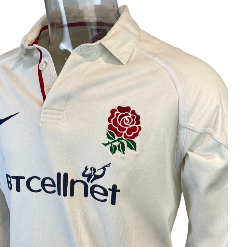 Up for grabs is this 1999 England Long Sleeve jersey. This Nike jersey is 100% cotton and one of the more simple yet nice looking England jersey designs Featuring the BT Cellnet sponsorship across the front the jersey is predominately all white with the occasional red stripes. For a white jersey it is in excellent condition. The bonus of these jerseys is if you give them a good soak the whiteness always comes back.