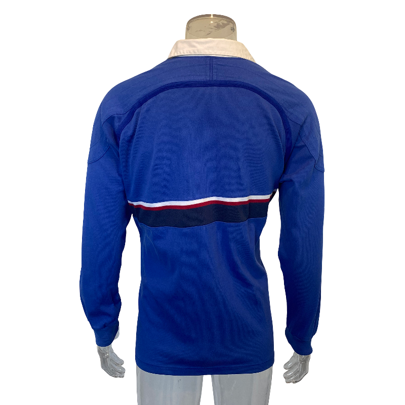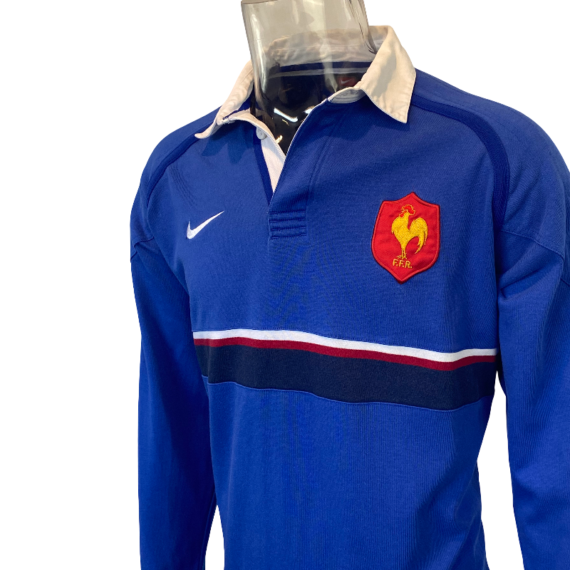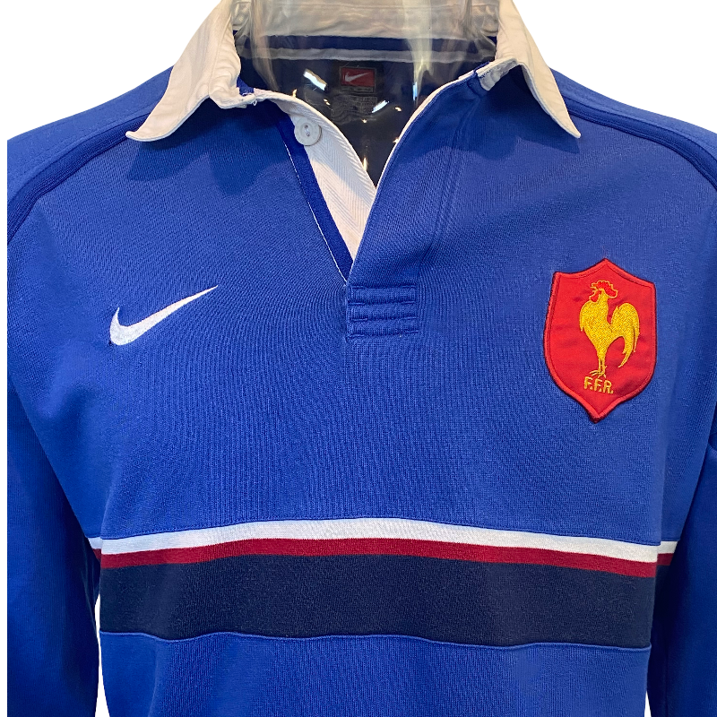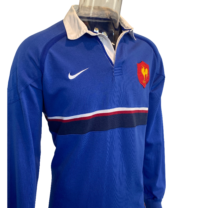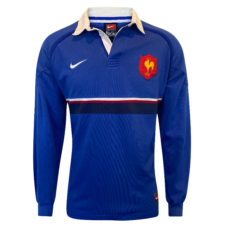 A classic 1999 France long sleeve rugby jersey, made by Nike. This high-quality 100% cotton jersey perfectly captures the iconic French colours and late-90s rugby style.