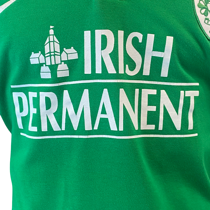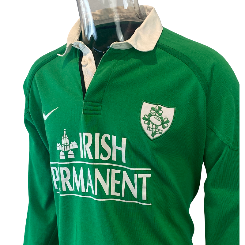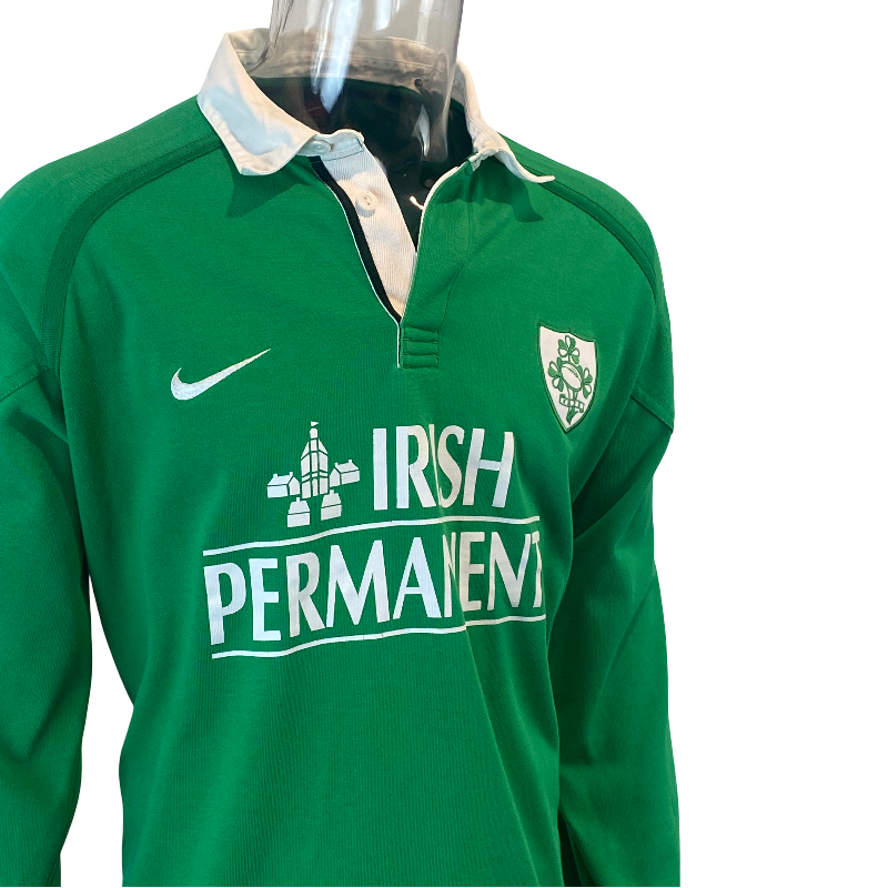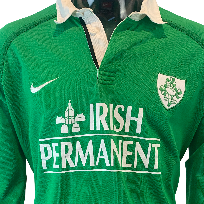 A classic 1999 Ireland long sleeve rugby jersey, made by Nike in 100% cotton and featuring the iconic Irish Permanent sponsor logo across the chest. This design is one of the most popular and recognizable vintage Ireland jerseys, a true throwback to the glory days of Lansdowne Road.