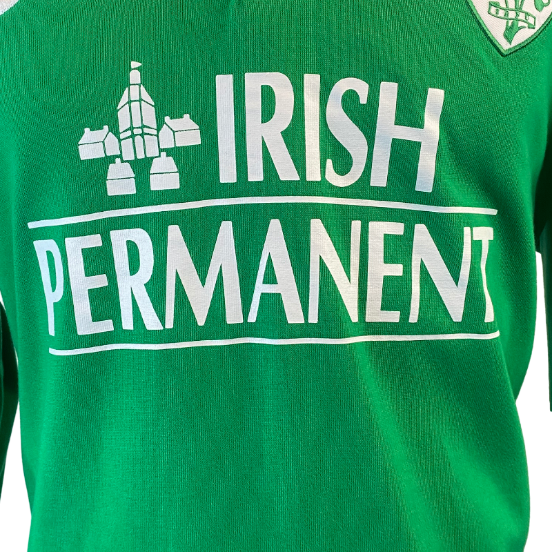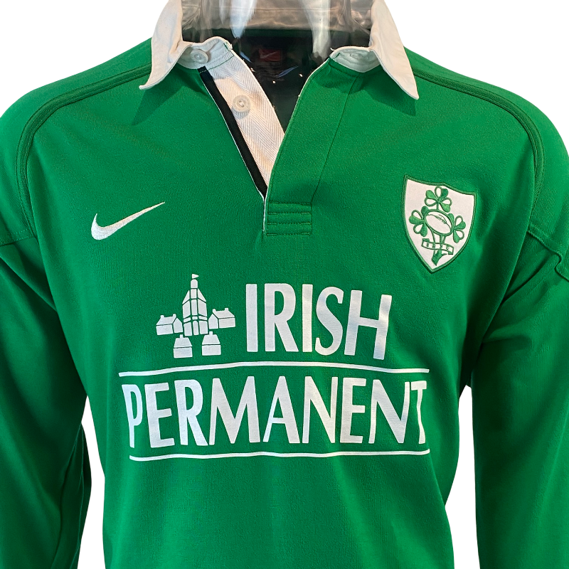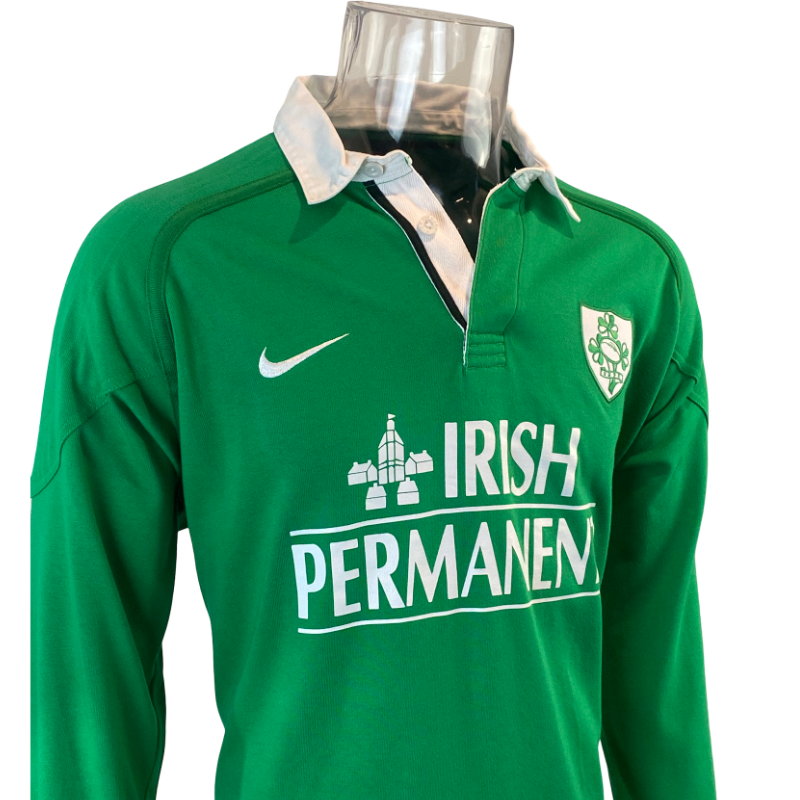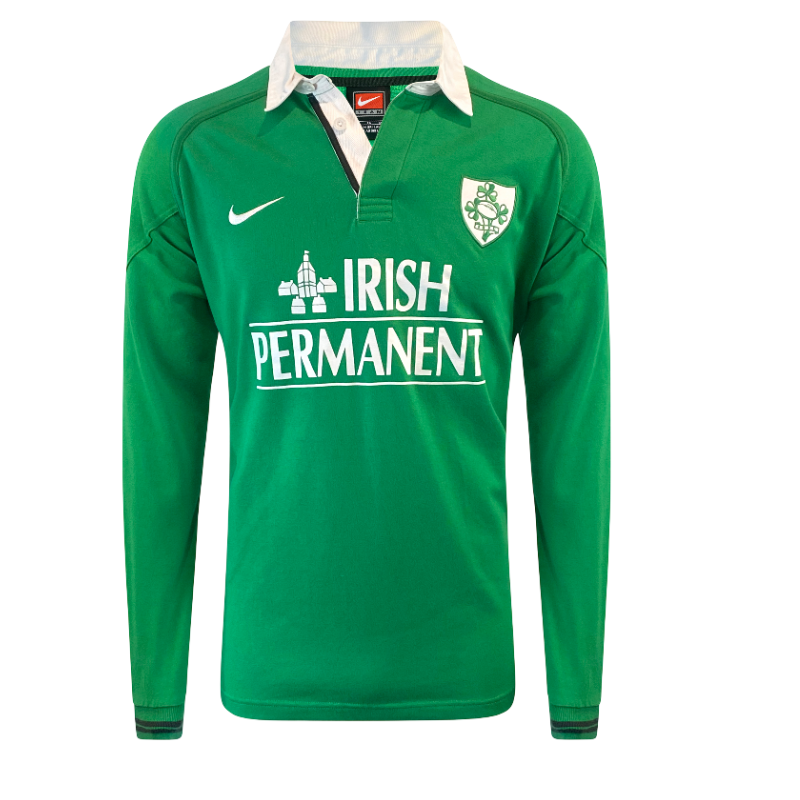 An all-time classic, this 1999 Ireland long sleeve rugby jersey by Nike is one of the most iconic and sought-after Irish jersey. Featuring the deep green base, traditional white collar and bold “Irish Permanent” sponsor across the chest, this jersey is instantly recognisable and a real throw back to the Lansdowne Road era. Made from 100% cotton, it delivers that authentic heavyweight feel that defines late-90s rugby kits, before the Polyester days.