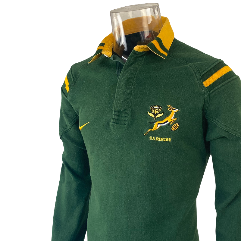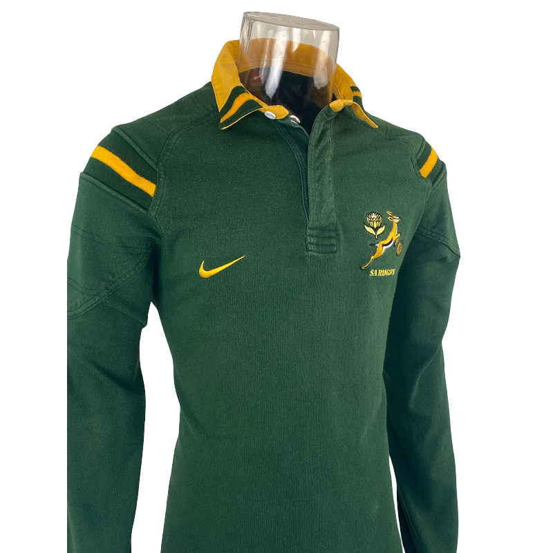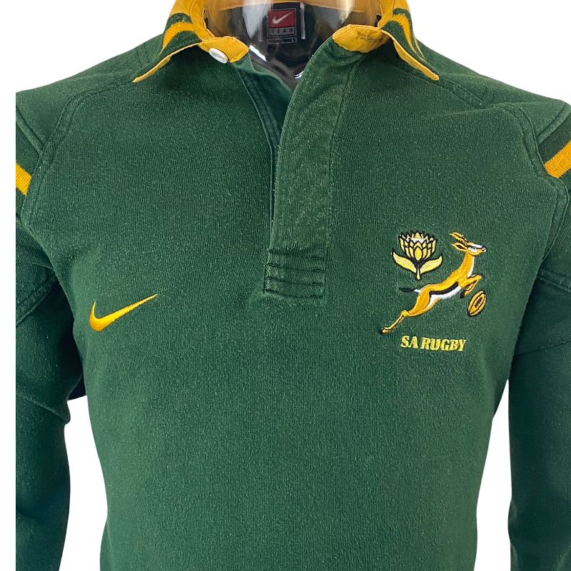 This 1999 South Africa Springboks long sleeve jersey by Nike is a classic late-90s cotton design, built in the durable heavyweight style Nike became known for in this era. Made from 100% cotton and tagged as a large, it carries the typical late-90s Nike fit—slimmer through the body but very long, measuring 83cm in length.