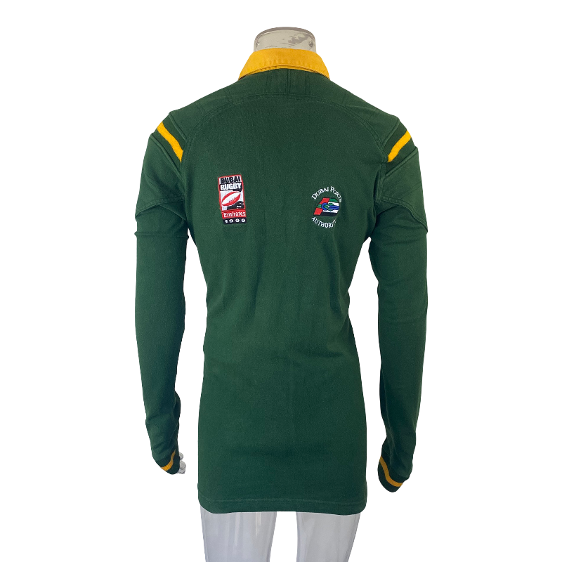 The jersey is in very good condition overall, showing strong colour and structure, with the only notable detail being the sponsor logos on the back from the 1999 Dubai Sevens, which adds a unique historical connection and character to the piece. A great long sleeve Boks jersey with a cool bit of tournament history behind it.