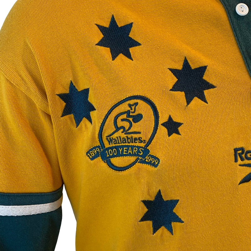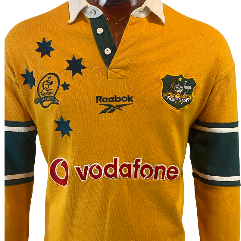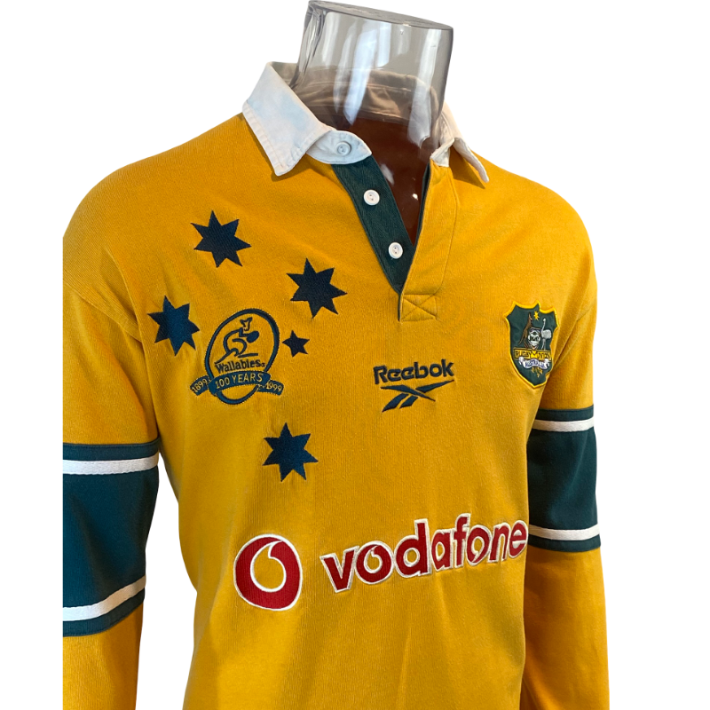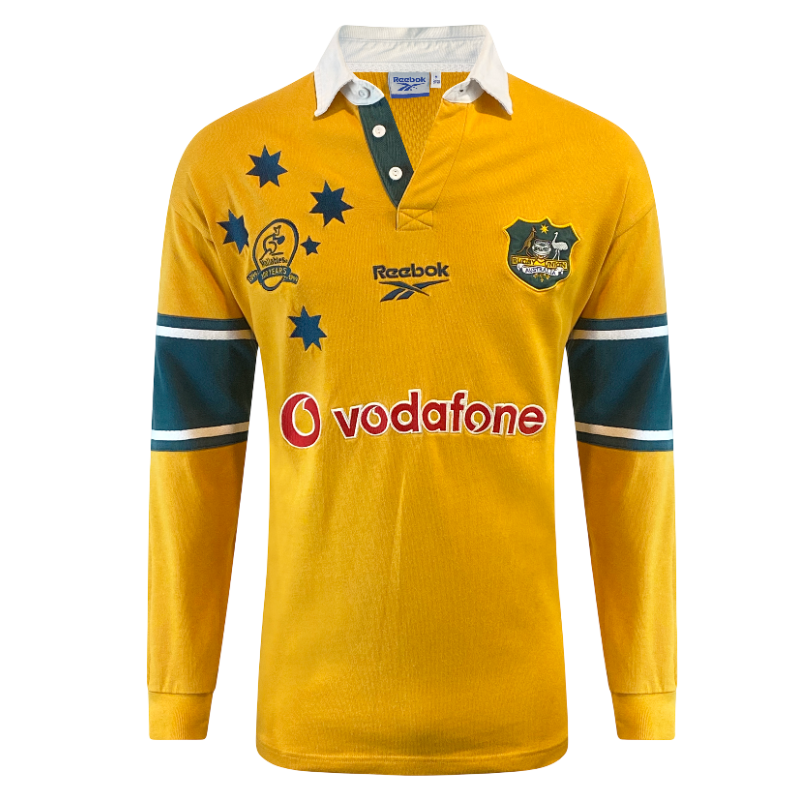 A standout piece from one of the greatest years in Australian rugby history, this 1999 Wallabies long sleeve jersey by Reebok celebrates the centenary of Australian rugby. Featuring the special 100-year anniversary crest alongside the classic Wallabies badge, this jersey is tied directly to the 1999 Rugby World Cup-winning campaign. The iconic Wallaby gold base is paired with green detailing and bold embroidered elements, including a fully stitched Vodafone sponsor, highlighting the premium quality of late-90s rugby jerseys.