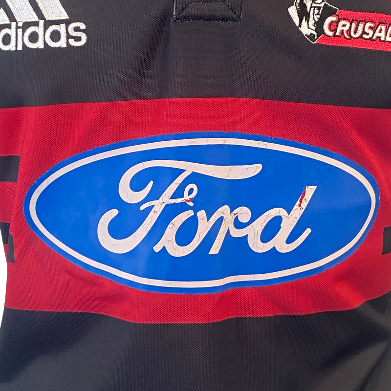 The jersey is in excellent condition, with all logos original. As is common with this release, the Ford sponsor logo is extremely delicate and shows typical fragility. The jersey has not been washed to preserve the logo, and hand washing is recommended while avoiding the sponsor area. A standout collector piece that perfectly captures early-2000s Super Rugby design.