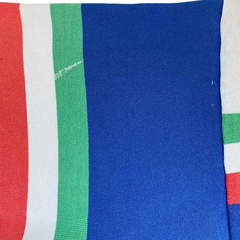 Condition: This jersey is well worn and has multiple flaws that give it authentic character. There is noticeable wash fade which has softened the original brightness, the collar shows signs of wear, there are some small paint marks on the sleeve, and the front logo is well worn. Tagged to fit true to size. Please review all photos carefully before purchase — a rare chance to own Italy’s most desirable jersey despite its imperfections.