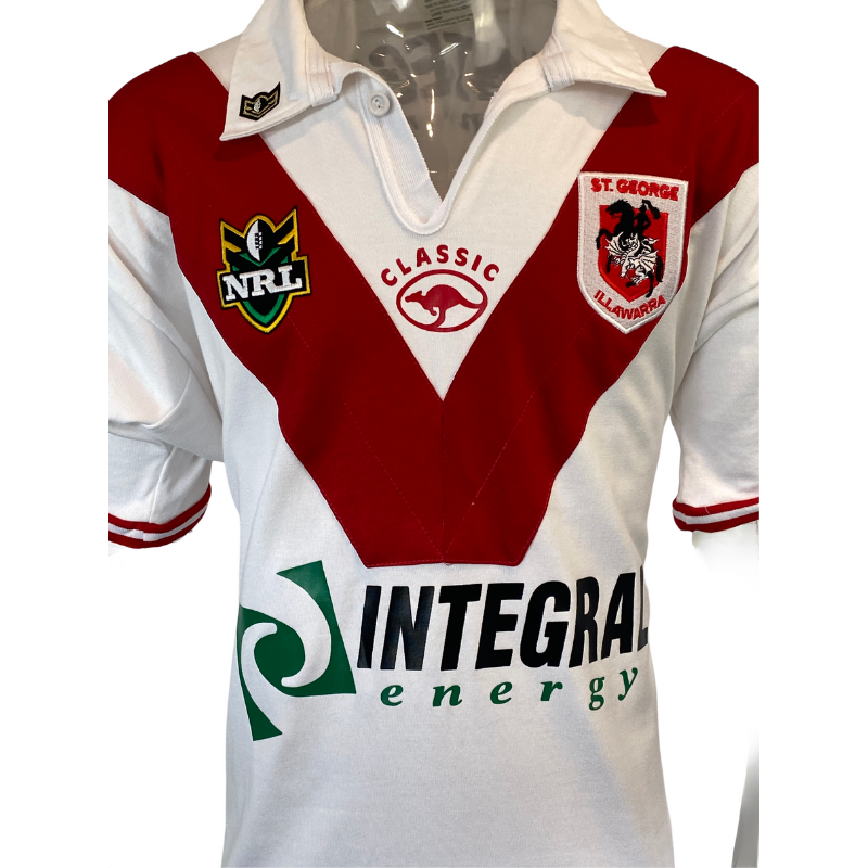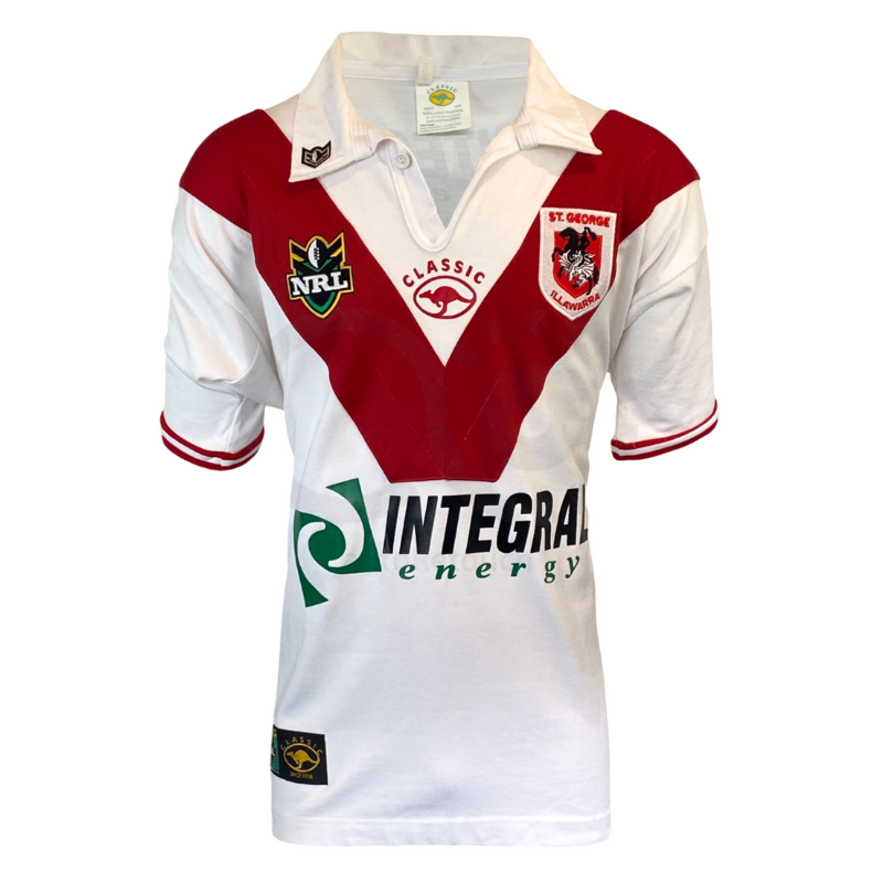 It is hard to believe that this jersey is almost 25 years old. Featuring the St George bank patches on each sleeve this is a impressive jersey that is in new condition with no flaws. Manufactured by Classic.
