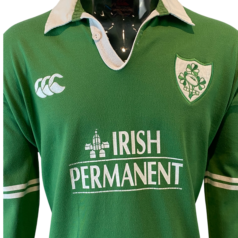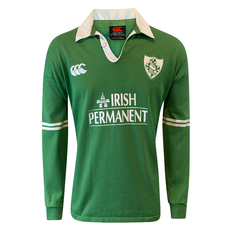 Classic 2001 Ireland long sleeve rugby jersey made by Canterbury of New Zealand. This was the first design following Ireland’s move from Nike to CCC, making it a highly sought-after piece for collectors.