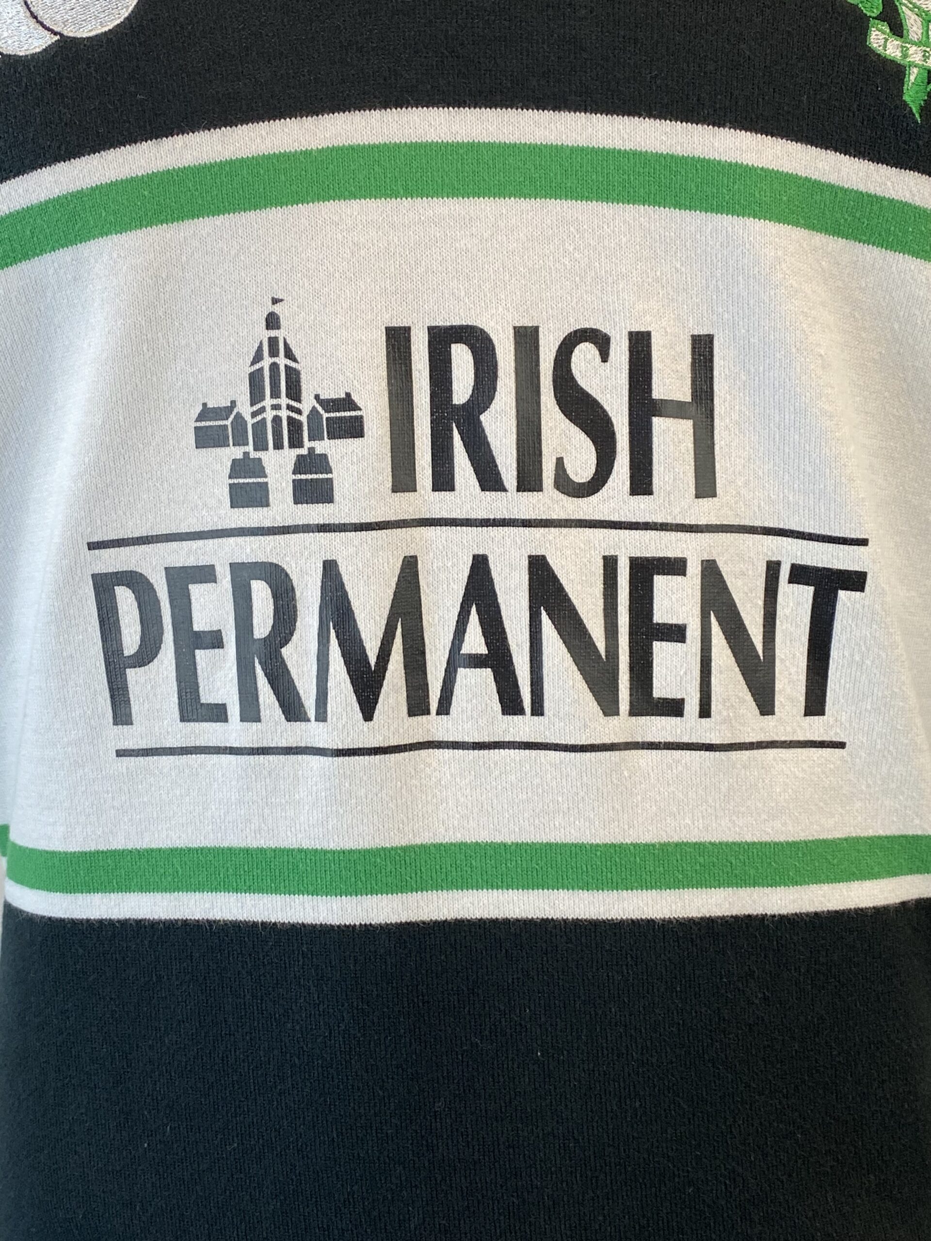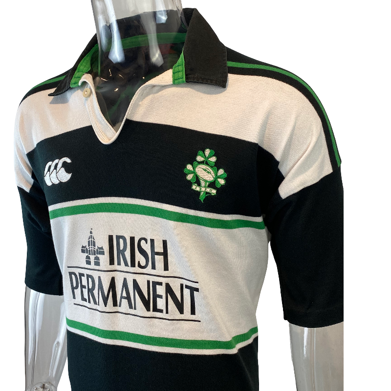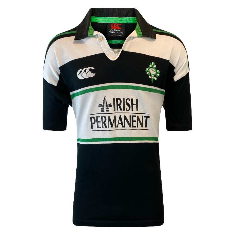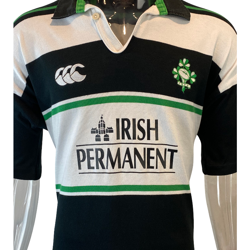 Here is a 2001 Ireland training jersey. This is a truly impressive jersey made by Canterbury of New Zealand. A awesome design with the black and white and Irish Permanent logo on the front. The condition of this jersey is excellent showing little signs of wear. The front and back logos are in pristine condition. This is a highly popular vintage Irish rugby jersey and only 1 available. Tagged XL it fits true to size.