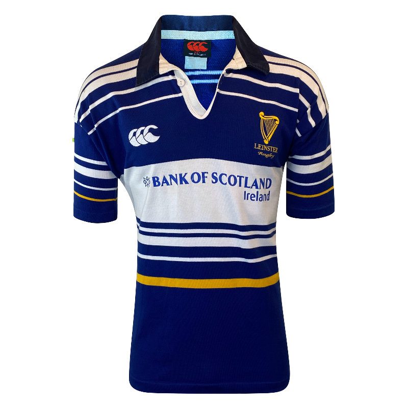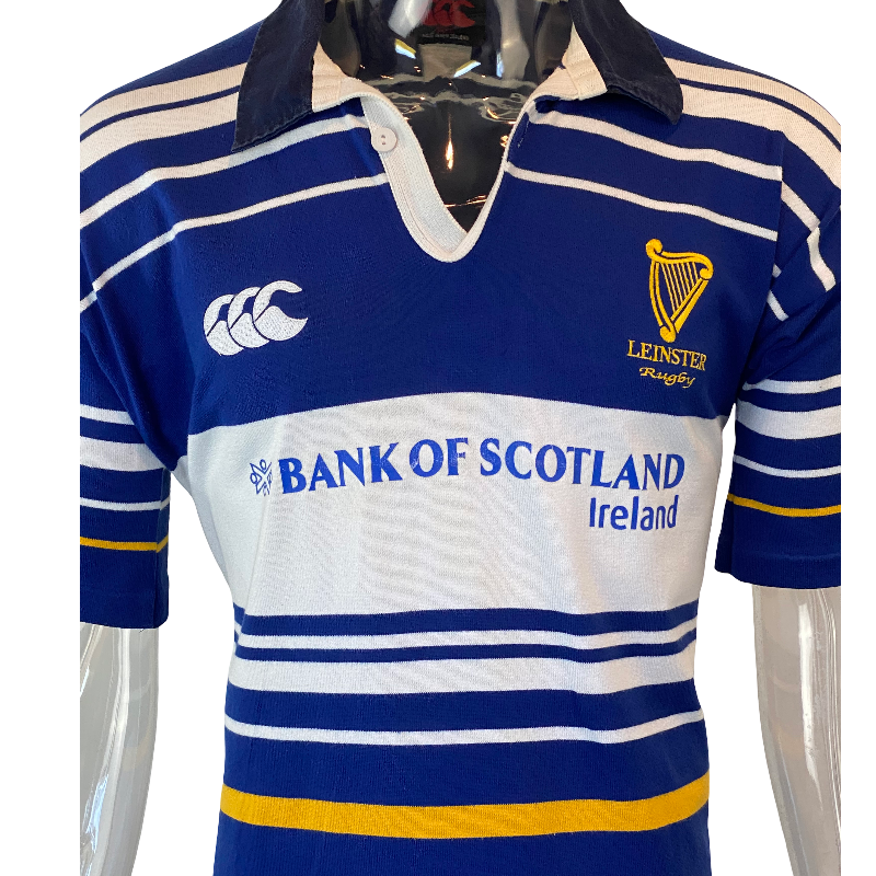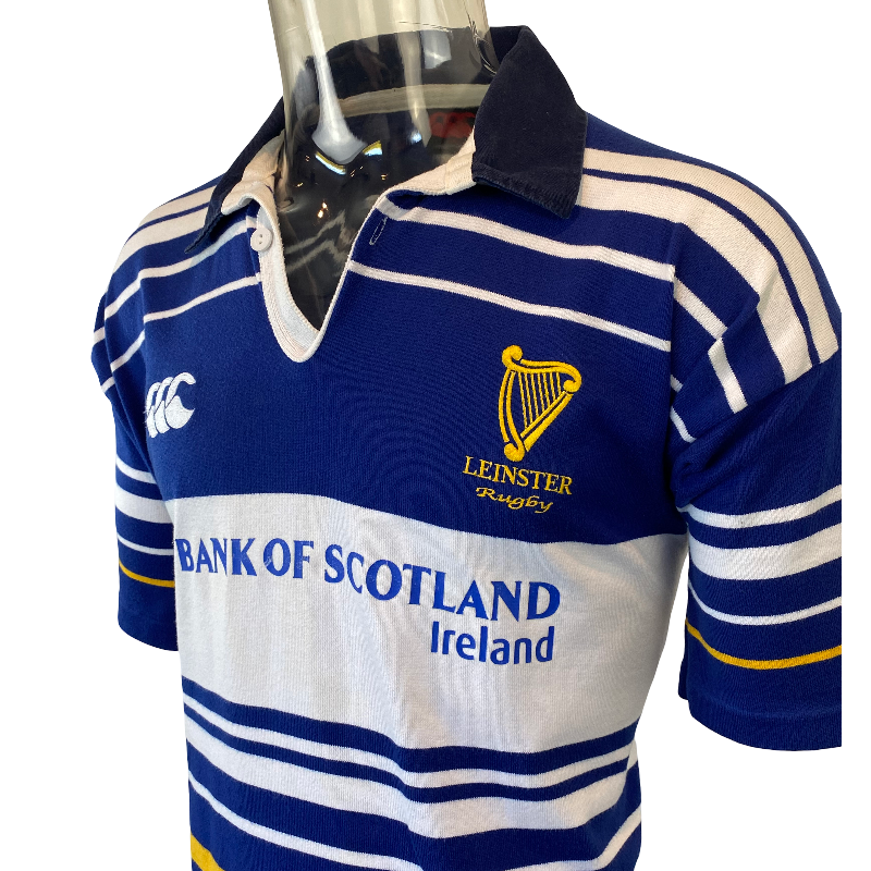Here is a rare 2001 Leinster jersey. Back by popular demand this jersey is highly requested. Made by Canterbury of New Zealand it is a impressive design. Featuring the Bank of Scotland logo as the front sponsor logo. The condition of this jersey is excellent with just some minor yellowing on the front however this is extremely faint and doesn’t even show up in photos. Tagged Large it fits true to size, good to wear as a medium or a large. This jersey will not last long.