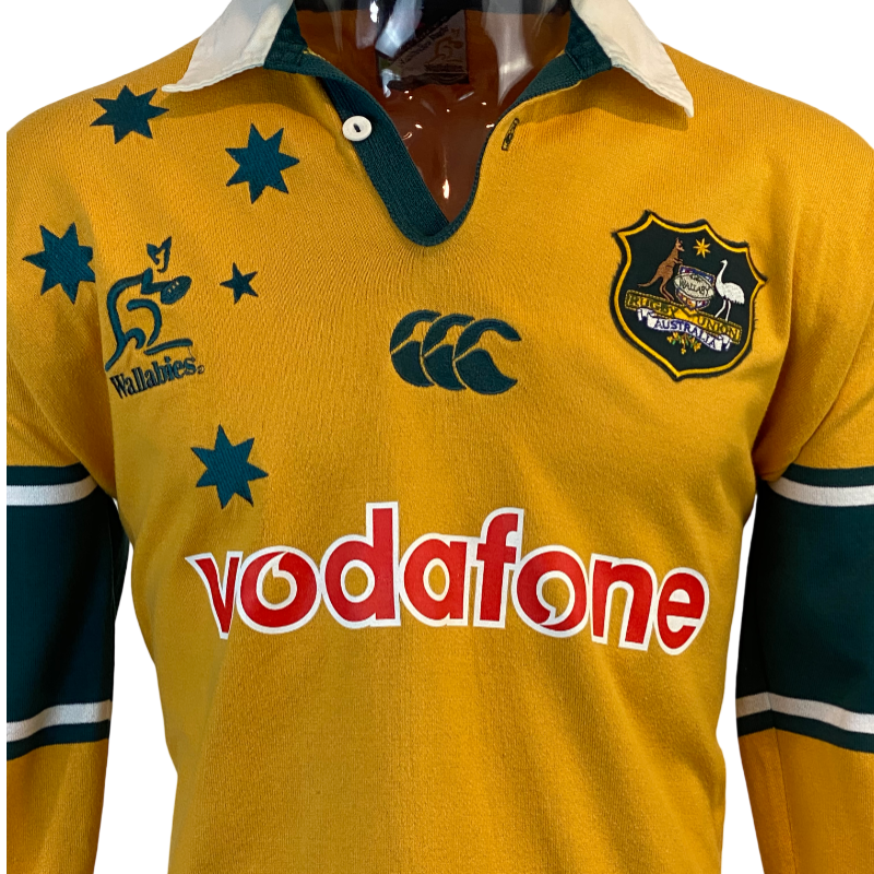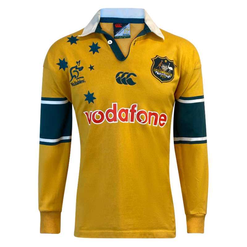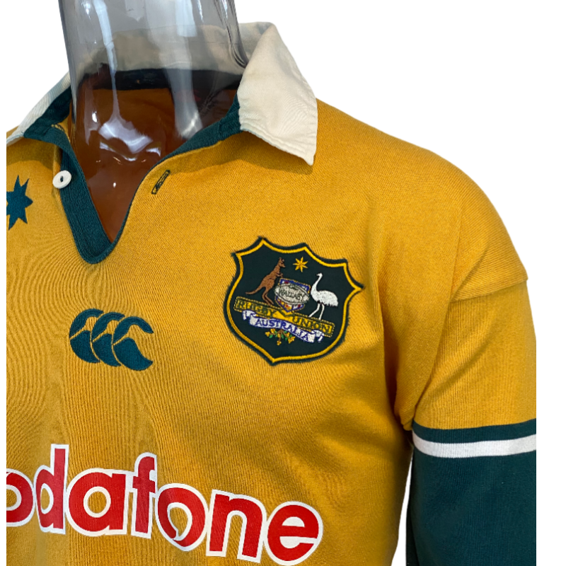 Up for grabs is the popular 2001 Wallabies Long Sleeve jersey. This jersey is a throwback to the glory days of Australian rugby where they held not only the World Cup but also the Bledisloe Cup. This is also the jersey the Wallabies wore when they last bet the All Blacks in New Zealand way back in 2001. 24 years have passed and the glory days have not returned however with a home world cup on the horizon the Wallabies could get back to those glory days. Get ready for a epic 2025 Lions tour with this jersey or just lock it in early for the 2027 Rugby World Cup. The condition of this jersey is very good, just some minor staining on the white collar.