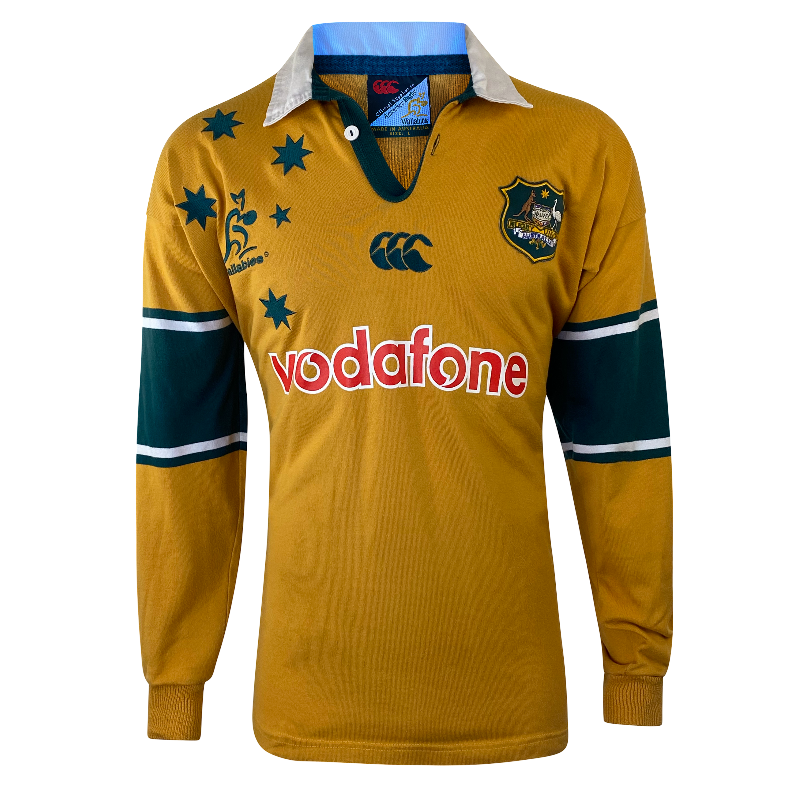 This is a 2001 Wallabies long sleeve jersey. This jersey is a throwback to the glory days of Australian rugby. This is the jersey the Wallabies wore while holding the Rugby World Cup and the Bledisloe Cup, it is also the jersey the Wallabies wore the last time they bet the All Blacks in New Zealand. Featuring the Vodafone logo on the front this jersey is in excellent condition with no significant flaws. Its a huge year for Wallabies fans with the 2025 Lions tour followed by a home world cup in 2027. Get ready today with this awesome jersey.