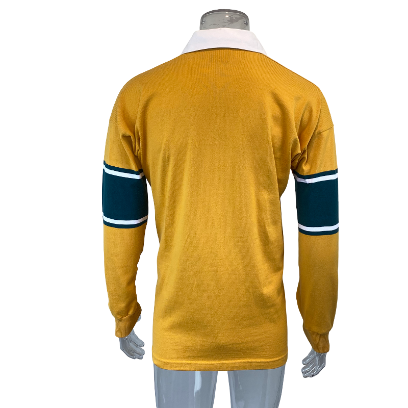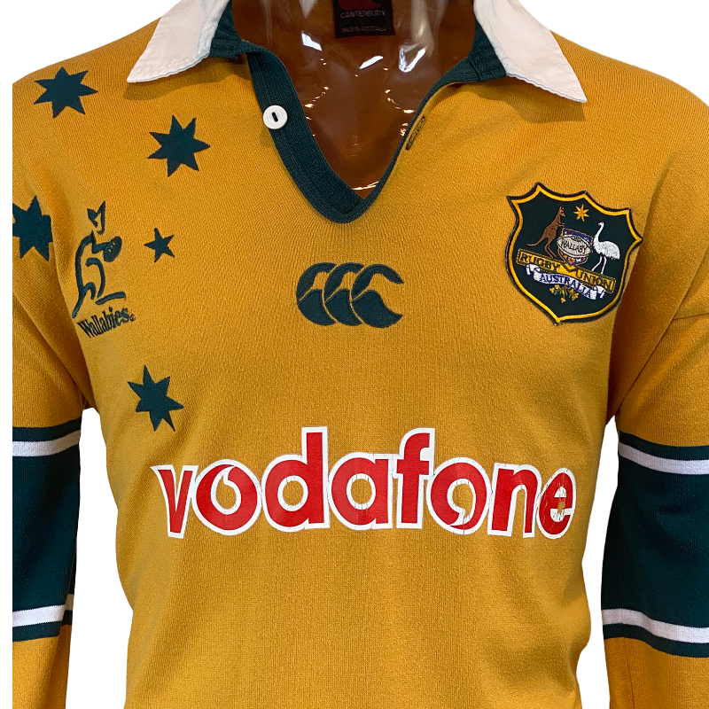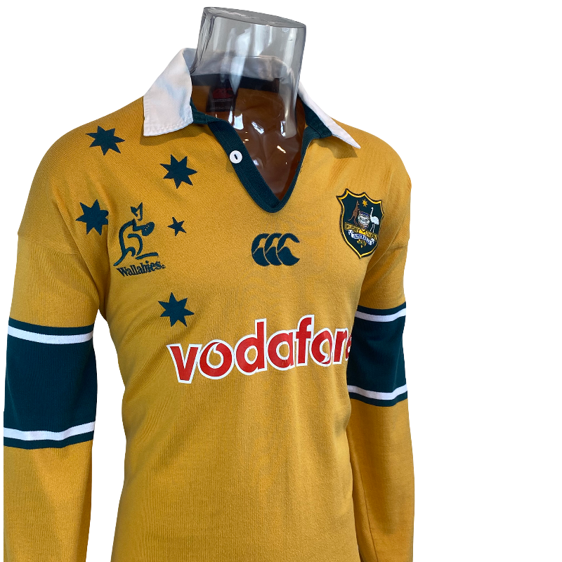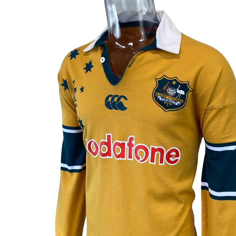 A classic jersey from Australia’s golden era — this 2001 short sleeve Wallabies jersey was produced by Canterbury (CCC) and remains one of the most popular designs among fans and collectors. Featuring the iconic gold body with green trim and the classic Wallabies logo on the chest, it is a true throwback to a time when Australia held both the Rugby World Cup and the Bledisloe Cup.