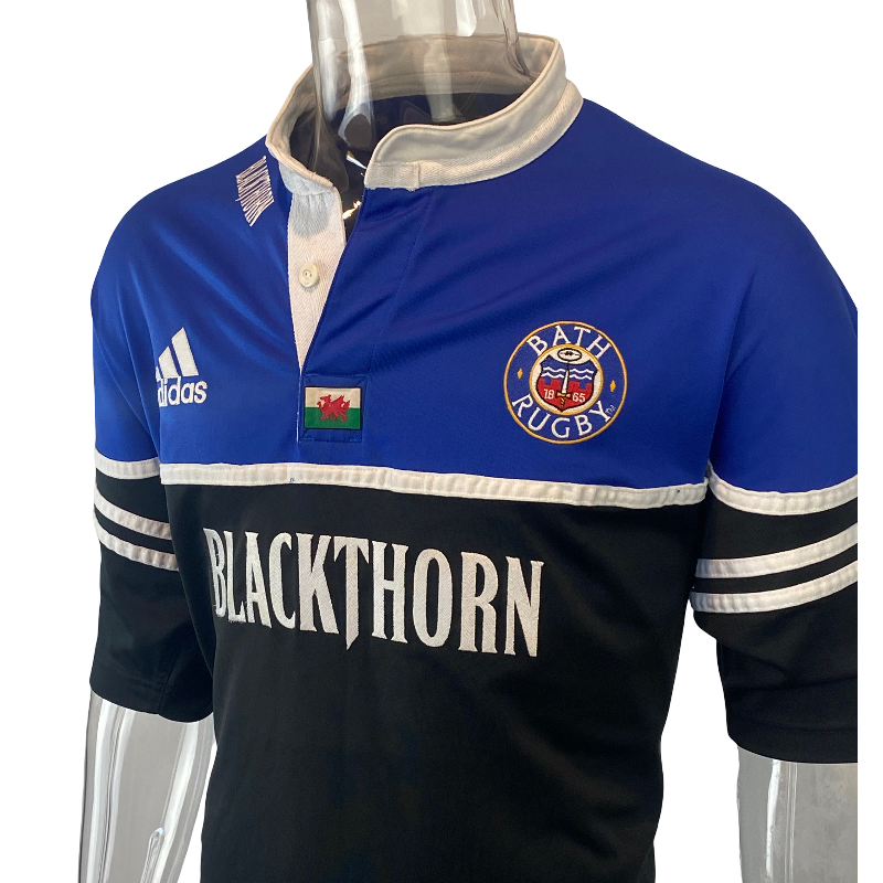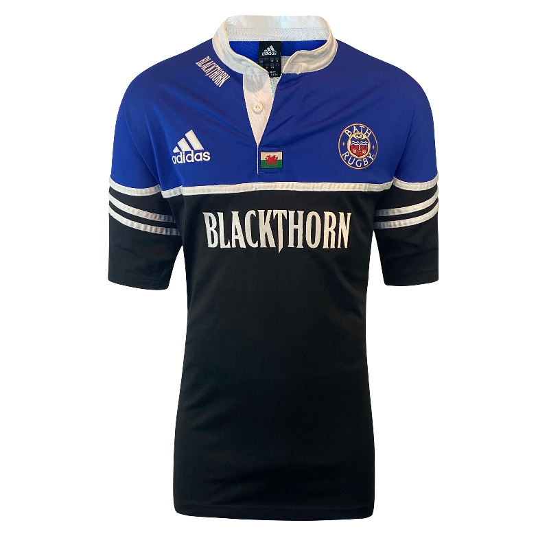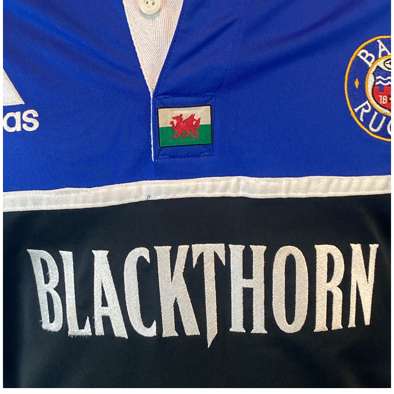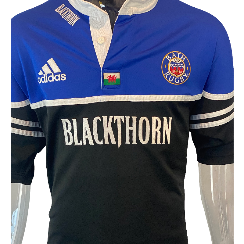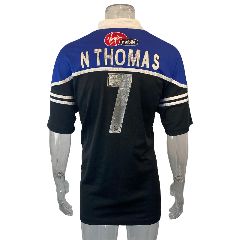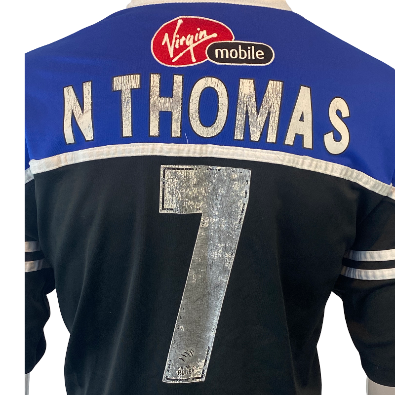 Authentic 2002 Bath Rugby players jersey, featuring the number 7 worn by Welsh international Nathan Thomas. This incredibly rare piece is likely match-worn and includes distinctive details such as the competition logo on the sleeve and a Welsh flag stitched at the base of the collar. A true collector’s item in excellent condition, with only minor wear to the number on the back. An iconic jersey from a respected era of Bath Rugby and a standout for any serious collection.