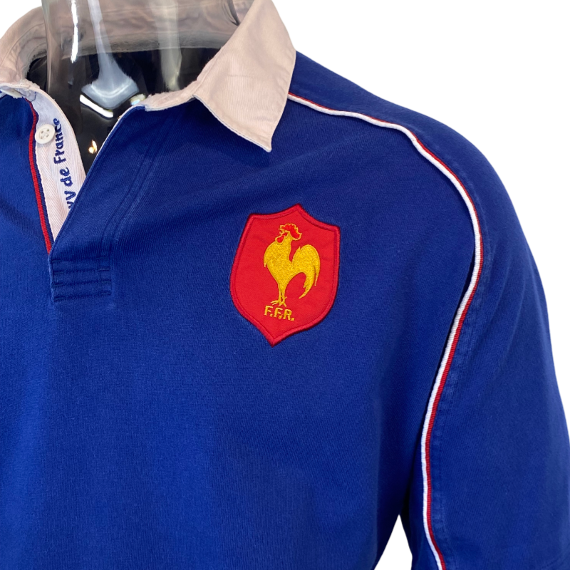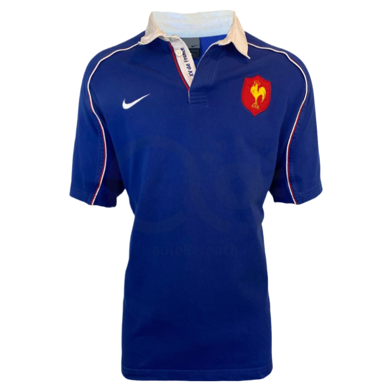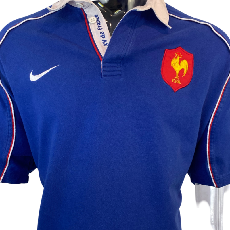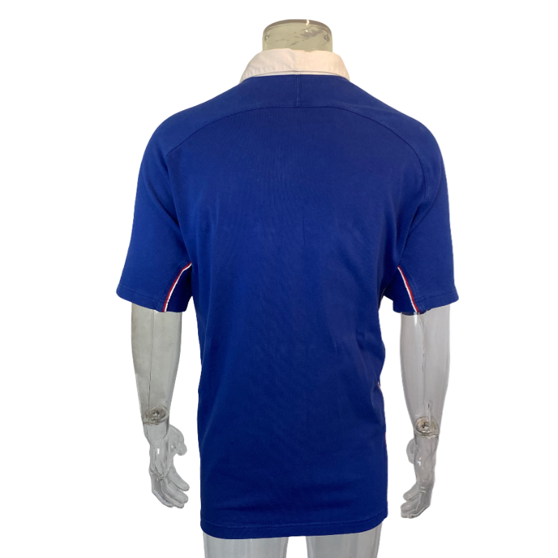 Score this 2002 France short sleeve jersey and be ready for the Six Nations. A simple but classic design made by Nike it is truly a clean striking jersey. The condition of this jersey is excellent with only flaw being some dye run on the white collar which has given it a red tinge. This should improve however with more washing.