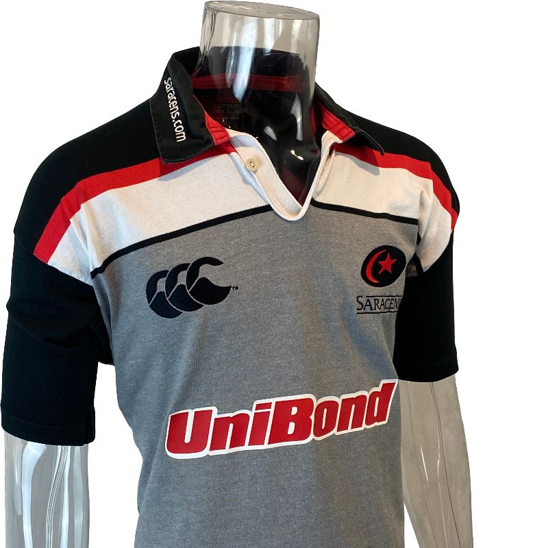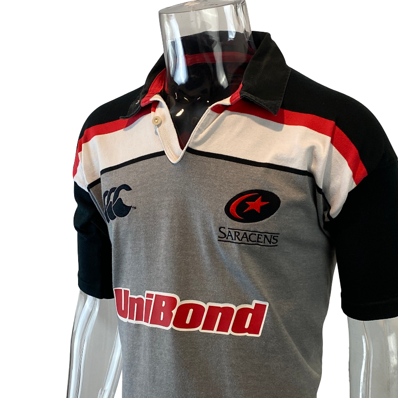 This 2002 Saracens short sleeve training jersey, made by Canterbury of New Zealand, is a high-quality design from one of England’s most well-known rugby clubs. Featuring multiple sponsor and team logos across the front and back, all in excellent condition, this jersey reflects the professional era of English club rugby in the early 2000s.