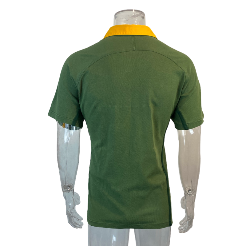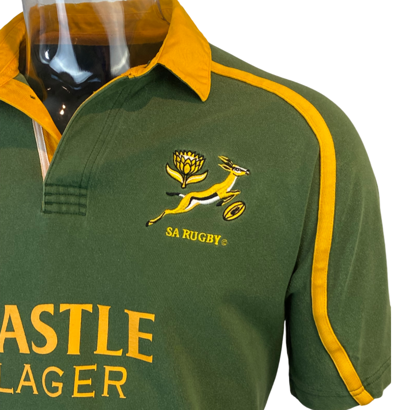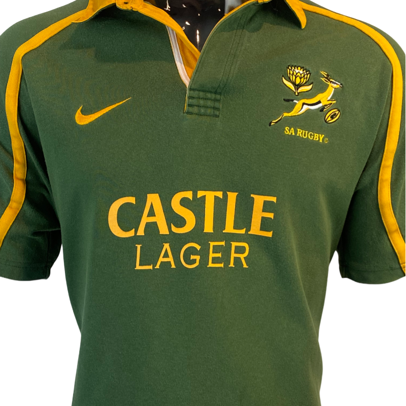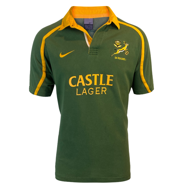Up for grabs is this 2002 Springboks jersey. Made by Nike it is a high-quality jersey featuring the white strip down the collar and a larger SA Rugby emblem. The Castle Lager front logo is in excellent condition. Overall the body of the jersey is excellent with only flaws being the color has faded and a light smudge under the armpit. These Nike jerseys are popular due to the quality and durability of the jerseys. Made in Sri Lanka.