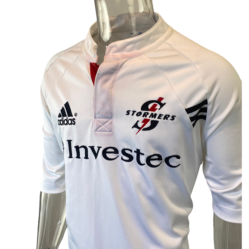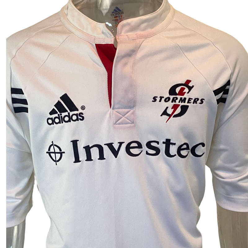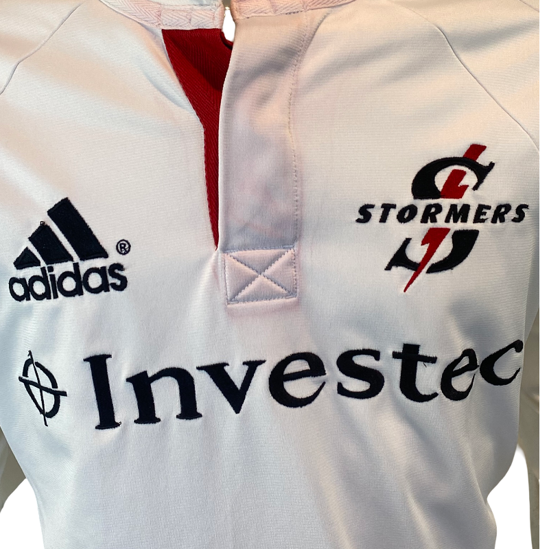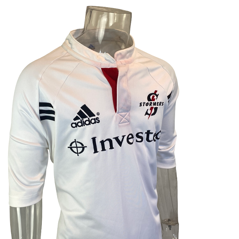 A clean and classic early-2000s design — this 2002 Stormers alternate rugby jersey by Adidas showcases the team’s traditional power and South African rugby pride. The crisp white colourway with red collar detailing made it a standout among Super 12 fans, perfectly reflecting the Stormers’ strong following and the passionate Cape Town rugby culture that surrounds the club.