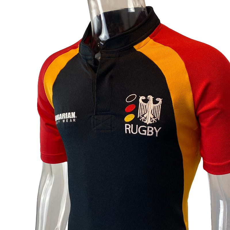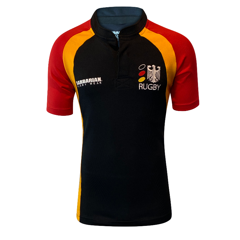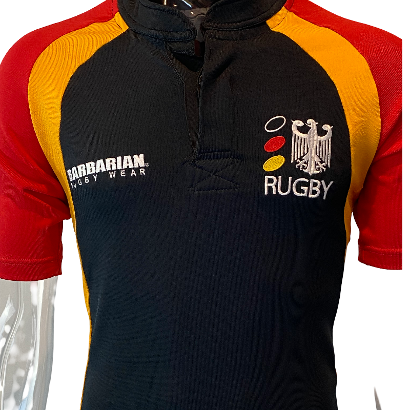 A rare find — this 2003 Germany long sleeve rugby jersey is made by Barbarian, known for their top-tier craftsmanship. Germany rugby jerseys are hard to come by, making this a unique addition to any collection. Featuring a striking black design, this jersey is built to last with heavyweight fabric that offers surprising stretch. Tagged size Large, but fits closer to a Small–Medium due to the snug cut and stretch.