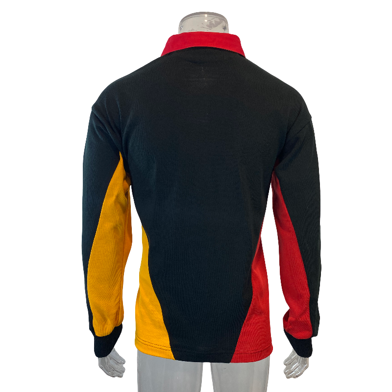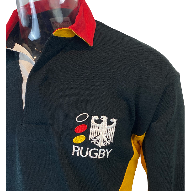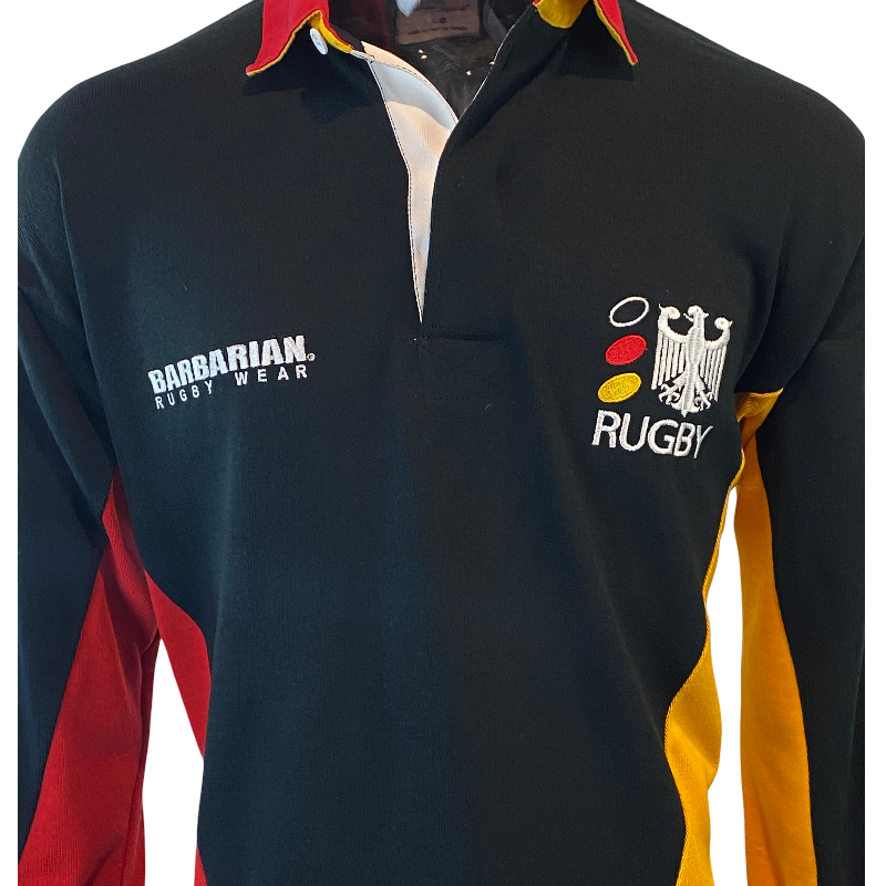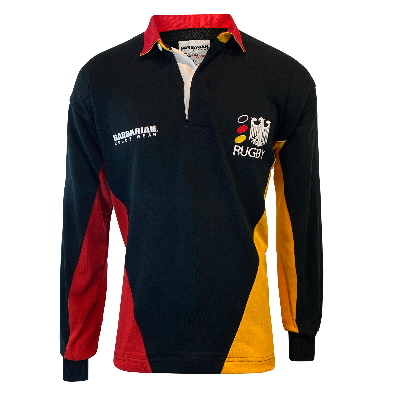 This is a very rare 2003 Germany long sleeve jersey. While Germany is not an international rugby powerhouse they do have an impressive black jersey. Made by Barbarian this is a very heavy-duty jersey weighing 0.68kg. Germany mainly wear this black, red and yellow jersey but also have a white version as their alternative jersey. This jersey is in excellent condition and has years of wear left in it.
