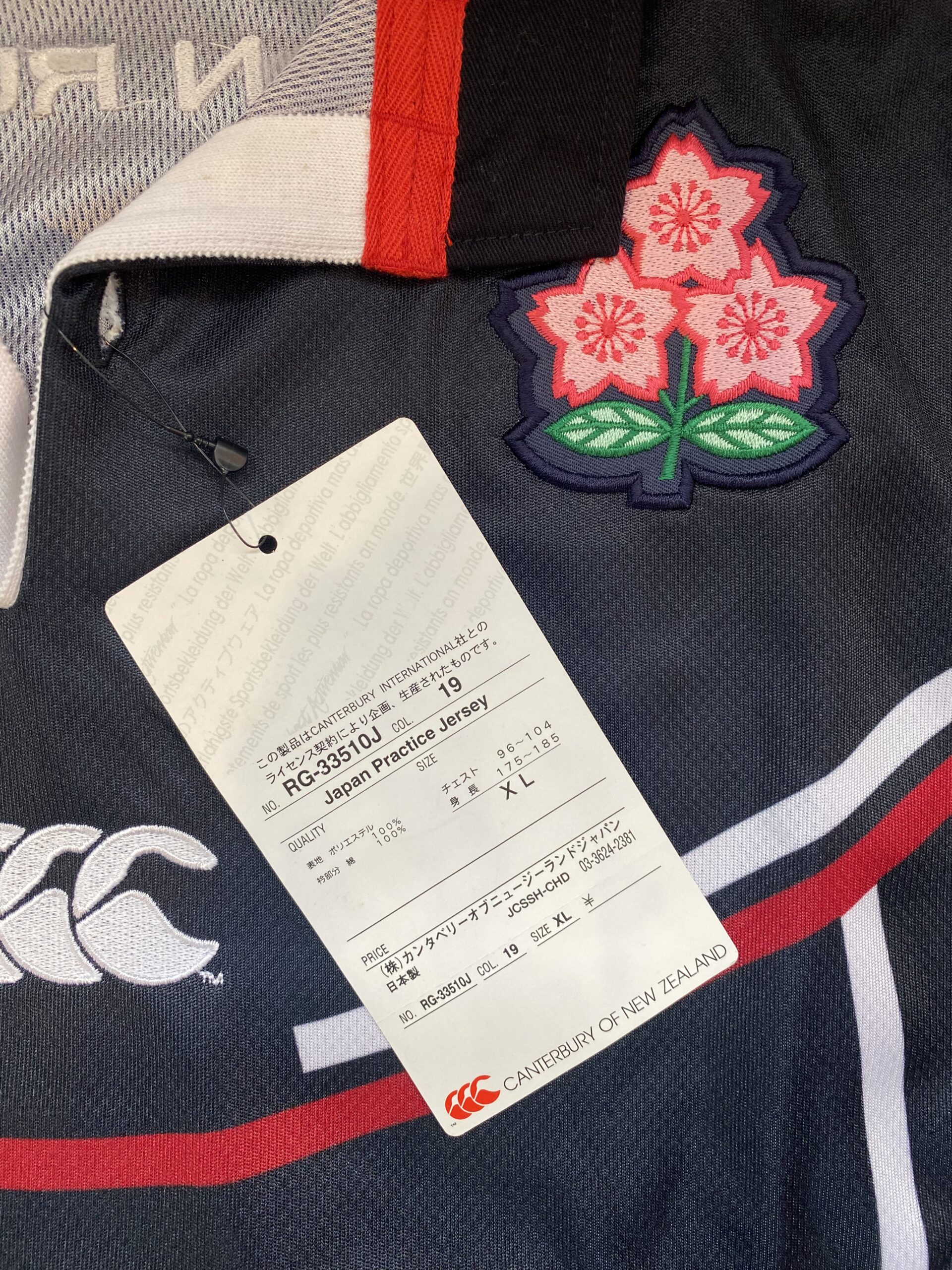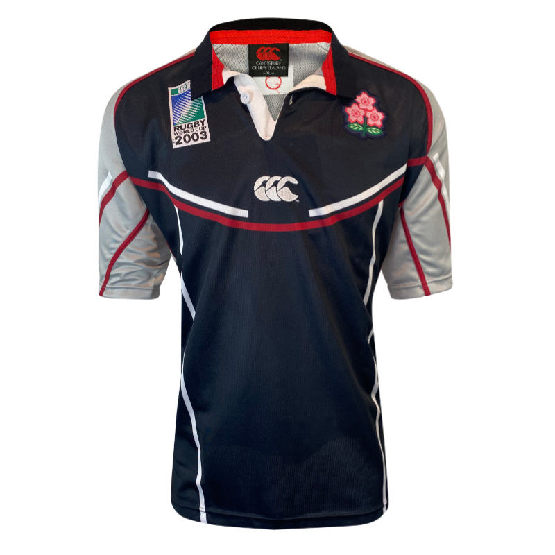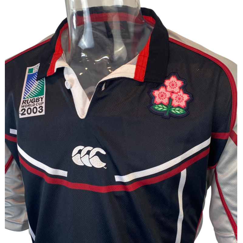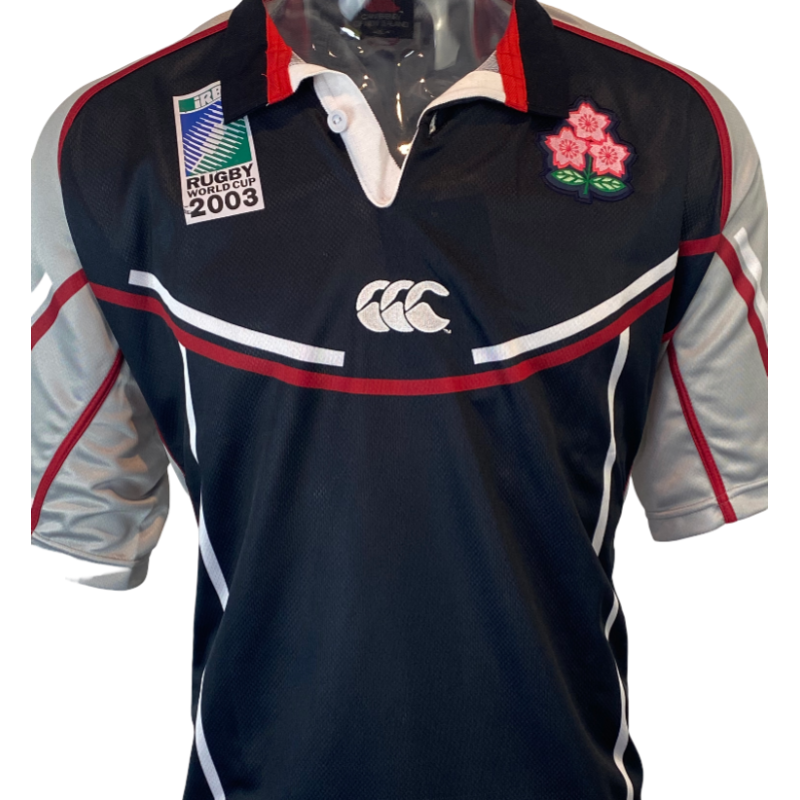 Awesome looking 2003 Japan Rugby World Cup training jersey still with original tags attached. This jersey is in new condition and has been stored well for the last 22 years. Black and Grey featuring the Japan rugby emblem and 2003 Rugby World Cup logo. The tag refers to this as Practice jersey so was used by the Japan team as a training jersey. A very rare jersey to find let alone with the original tags still attached.