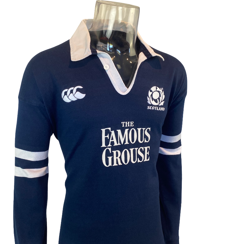 This 2003 Scotland long sleeve jersey by Canterbury is a modern classic from the early 2000s era of international rugby. Finished in traditional navy with white detailing, it features the iconic “The Famous Grouse” sponsor across the chest — one of the most recognisable and nostalgic sponsor pairings in Scottish rugby history.